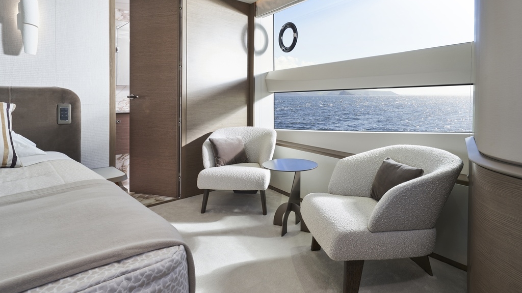 – Main deck Master Stateroom – optional chaise longue with integrated storage in place of armchairs and table to port side