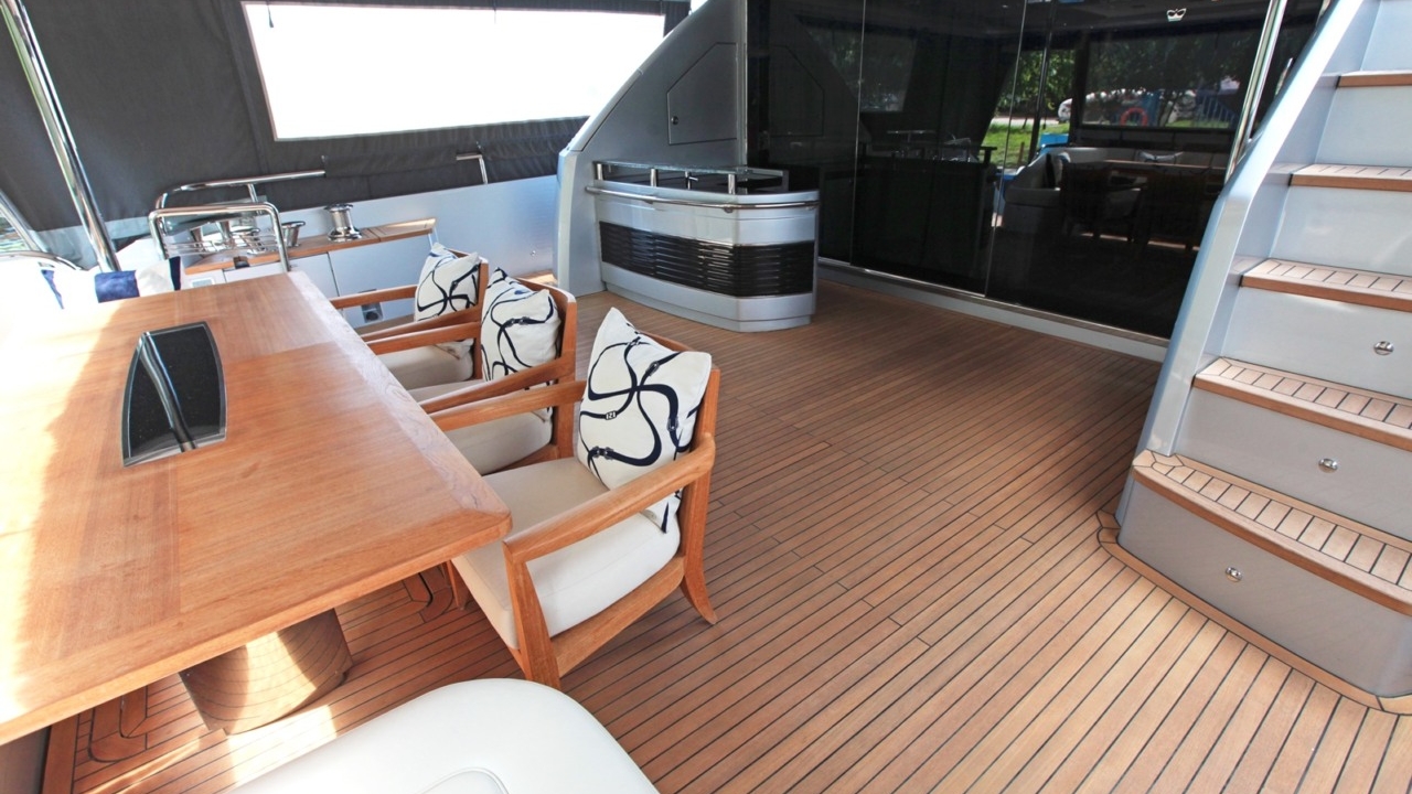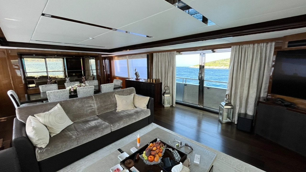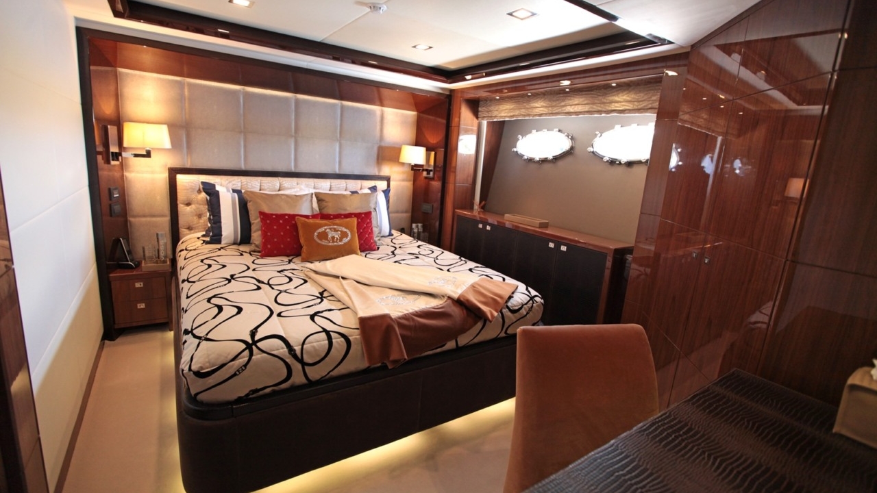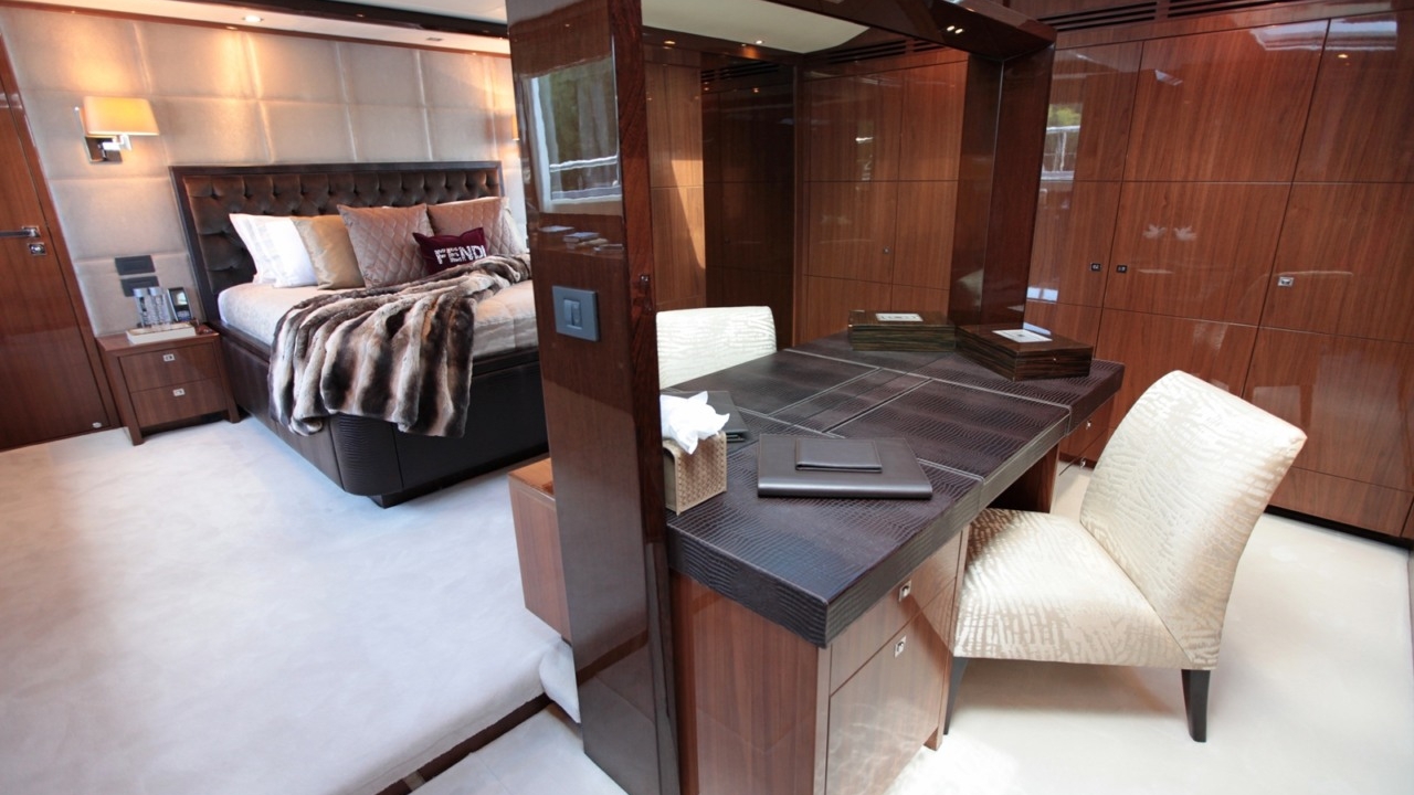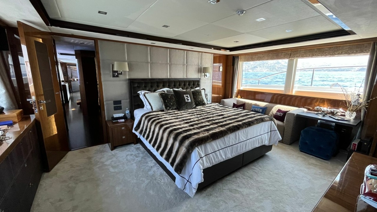 Princess 32M was built in 2013 and has undergone the 2021-2022 refit. The black and gray color planing hull is 32 m long and 7.11 m wide. The highlight of the yacht - textiles, upholstery and bedding - are done by Fendi, giving a classic style interior a luxury feel. The sun deck with entertainment areas is equipped with an automatic folding bimini and offers a dining table for 10 people, a large bar, a barbecue, a sunbathing area and a jacuzzi. The main deck is filled with the sunlight and provides everything one may need: from 50-inch plasma TV to wine cooler. Lower deck spaces include 4 beautifully appointed cabins for 8 guests. A master cabin with a separate office which can also be used as a dressing room with a table, a spacious aft VIP cabin, a double cabin and a twin cabin. All cabins are en-suite and were also designed with a use of Fendi textiles.