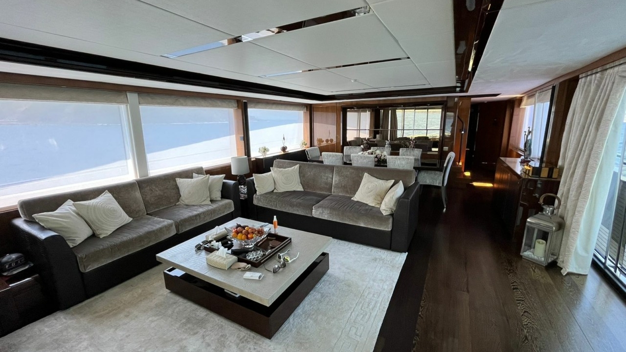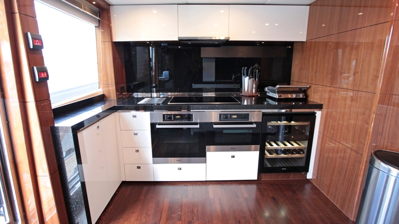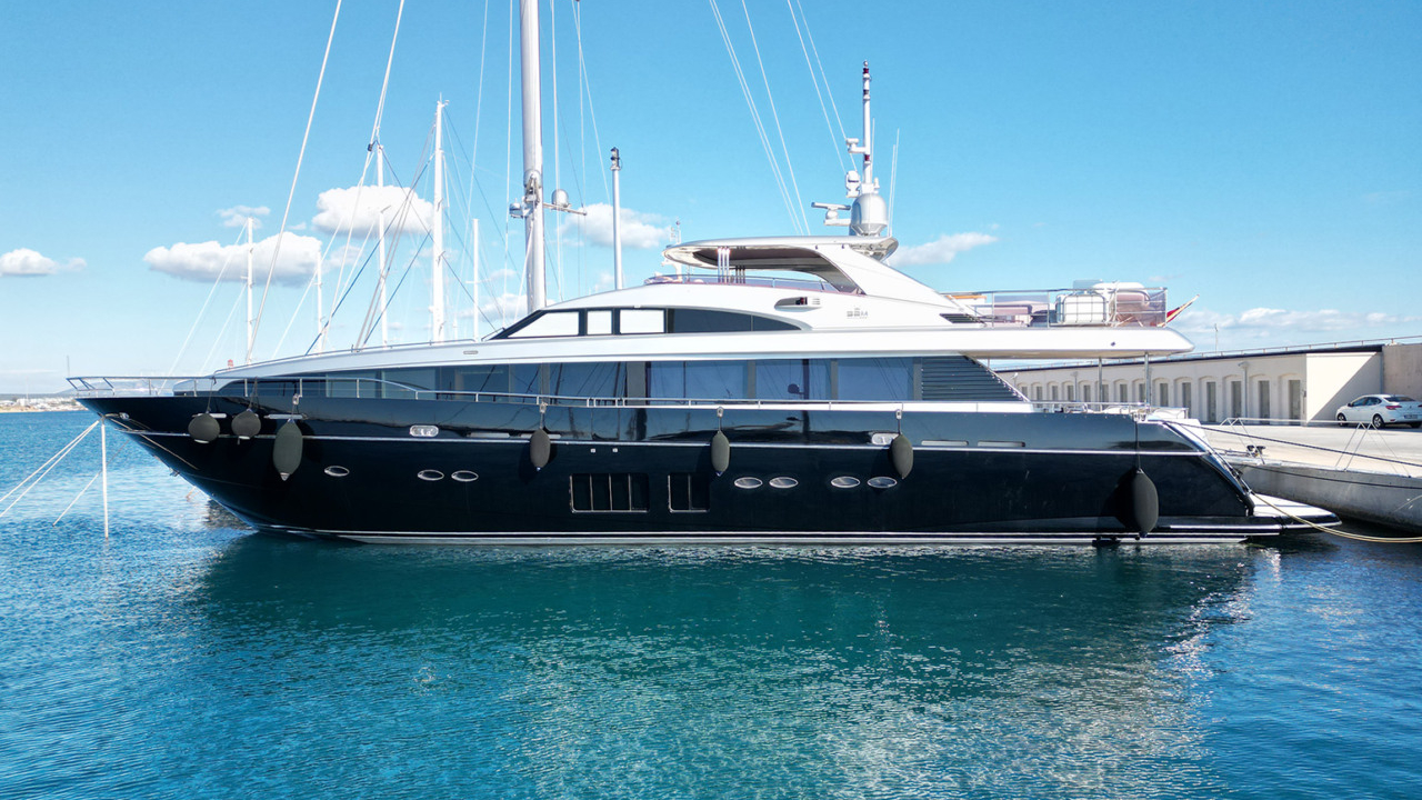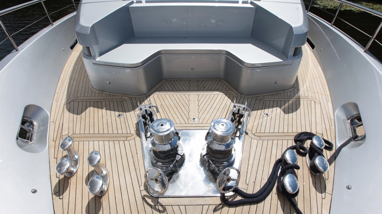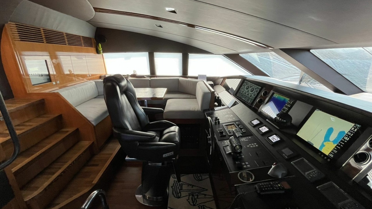 Princess 32M was built in 2013 and has undergone the 2021-2022 refit. The black and gray color planing hull is 32 m long and 7.11 m wide. The highlight of the yacht - textiles, upholstery and bedding - are done by Fendi, giving a classic style interior a luxury feel. The sun deck with entertainment areas is equipped with an automatic folding bimini and offers a dining table for 10 people, a large bar, a barbecue, a sunbathing area and a jacuzzi. The main deck is filled with the sunlight and provides everything one may need: from 50-inch plasma TV to wine cooler. Lower deck spaces include 4 beautifully appointed cabins for 8 guests. A master cabin with a separate office which can also be used as a dressing room with a table, a spacious aft VIP cabin, a double cabin and a twin cabin. All cabins are en-suite and were also designed with a use of Fendi textiles.