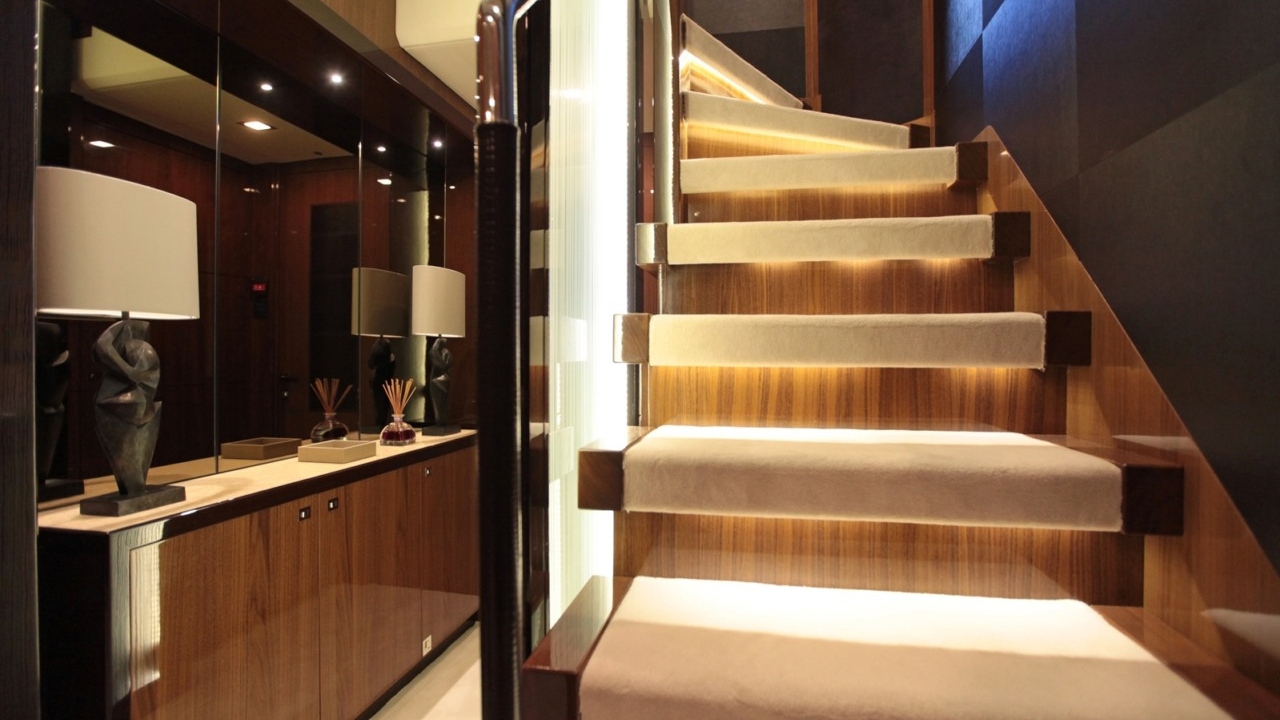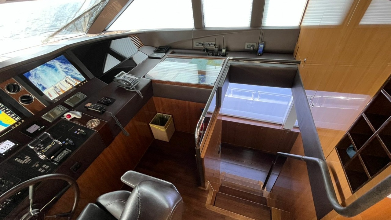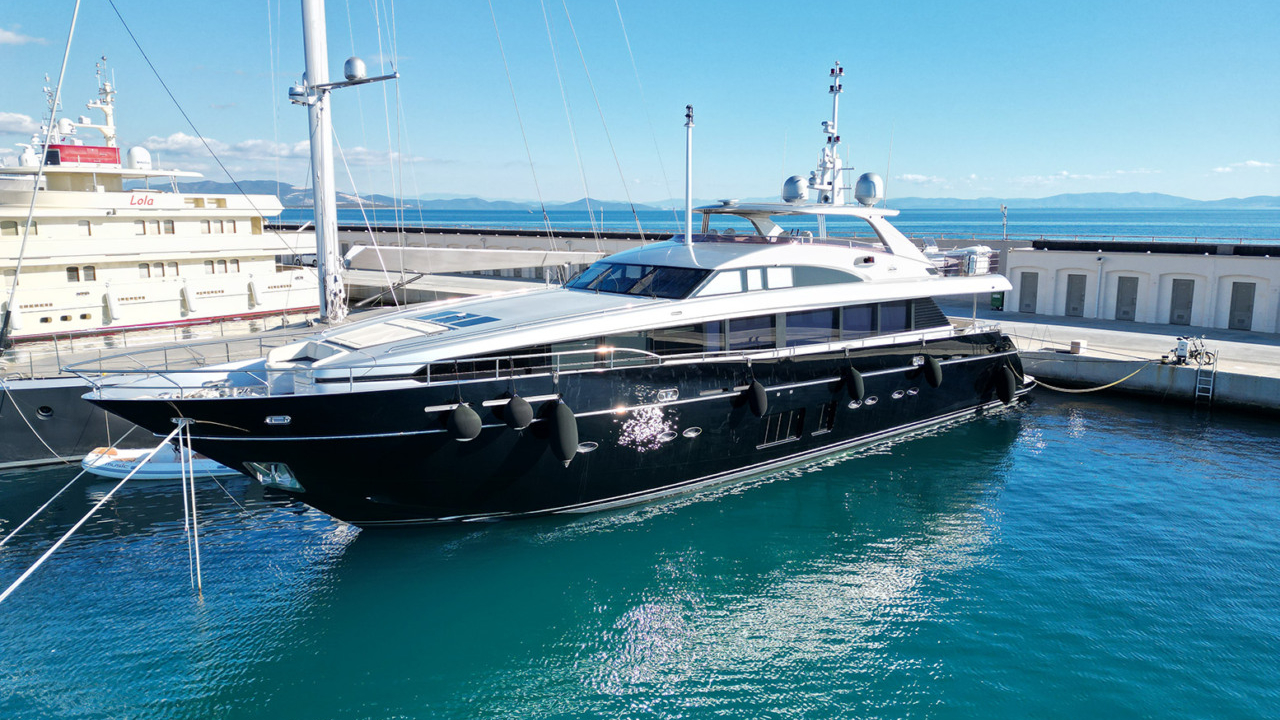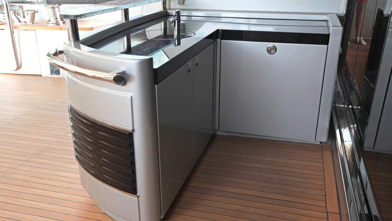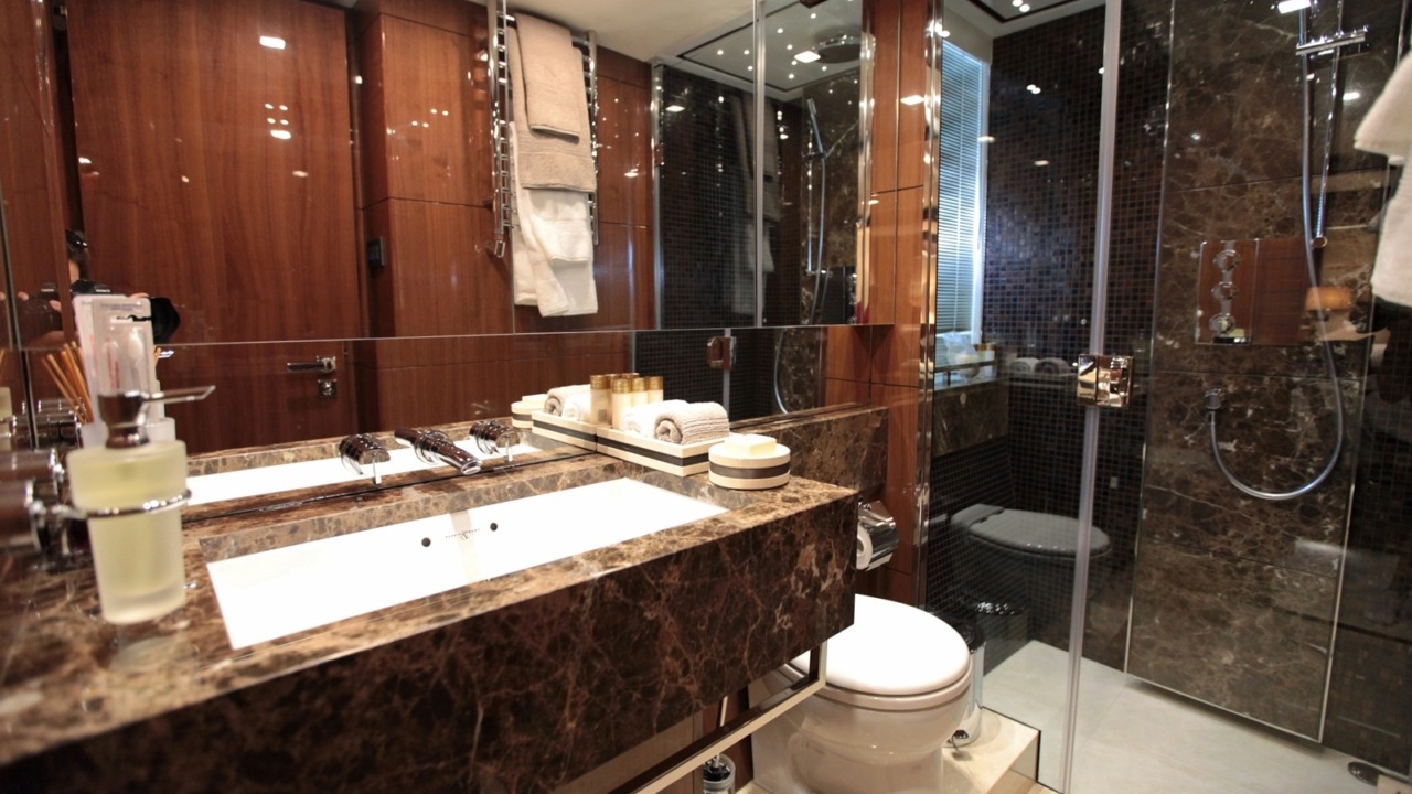 Princess 32M was built in 2013 and has undergone the 2021-2022 refit. The black and gray color planing hull is 32 m long and 7.11 m wide. The highlight of the yacht - textiles, upholstery and bedding - are done by Fendi, giving a classic style interior a luxury feel. The sun deck with entertainment areas is equipped with an automatic folding bimini and offers a dining table for 10 people, a large bar, a barbecue, a sunbathing area and a jacuzzi. The main deck is filled with the sunlight and provides everything one may need: from 50-inch plasma TV to wine cooler. Lower deck spaces include 4 beautifully appointed cabins for 8 guests. A master cabin with a separate office which can also be used as a dressing room with a table, a spacious aft VIP cabin, a double cabin and a twin cabin. All cabins are en-suite and were also designed with a use of Fendi textiles.