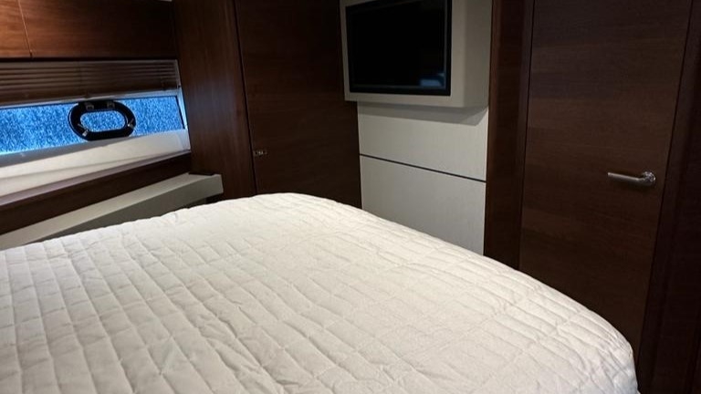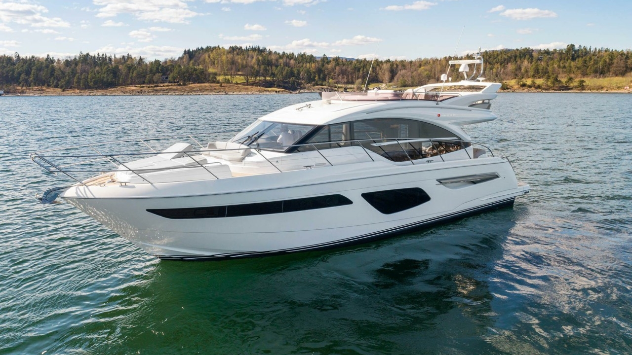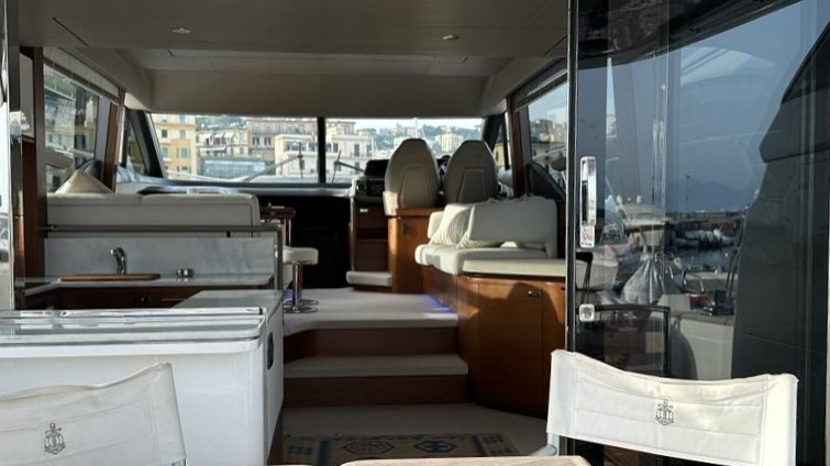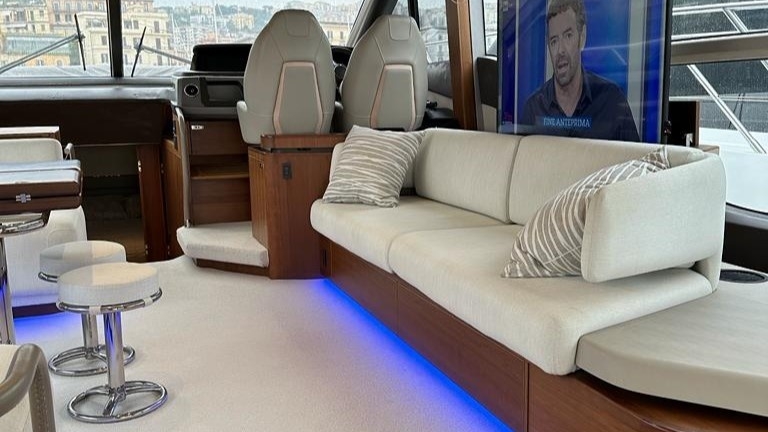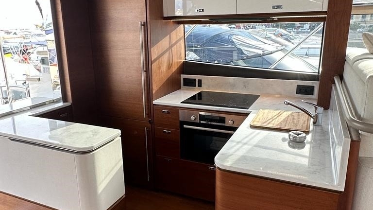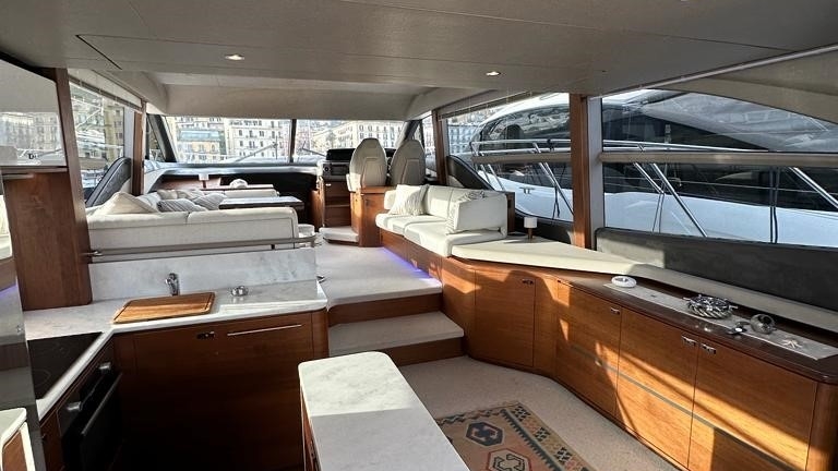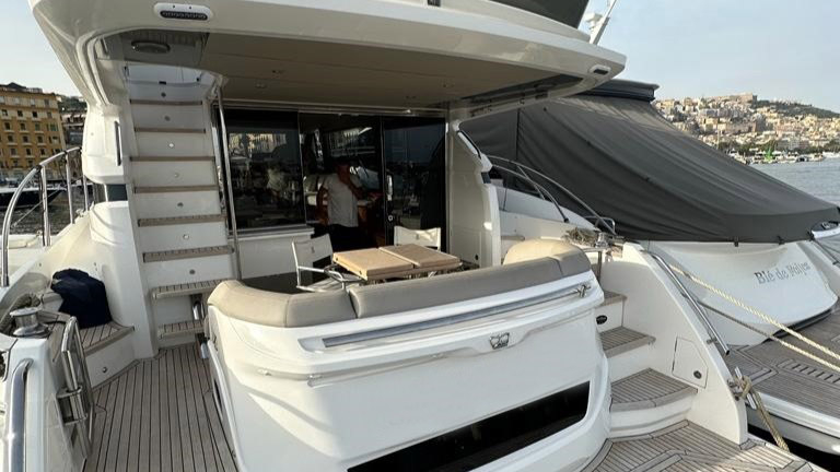Experience the open sea from the spacious flybridge, complete with a convenient wetbar. Inside, revel in the classic Princess layout, featuring a galley located aft, a separate lounge zone with TV and helm.