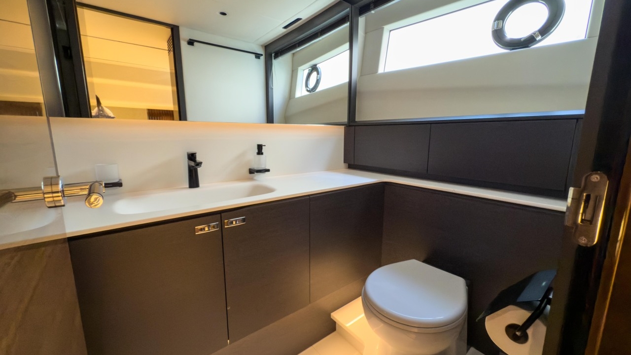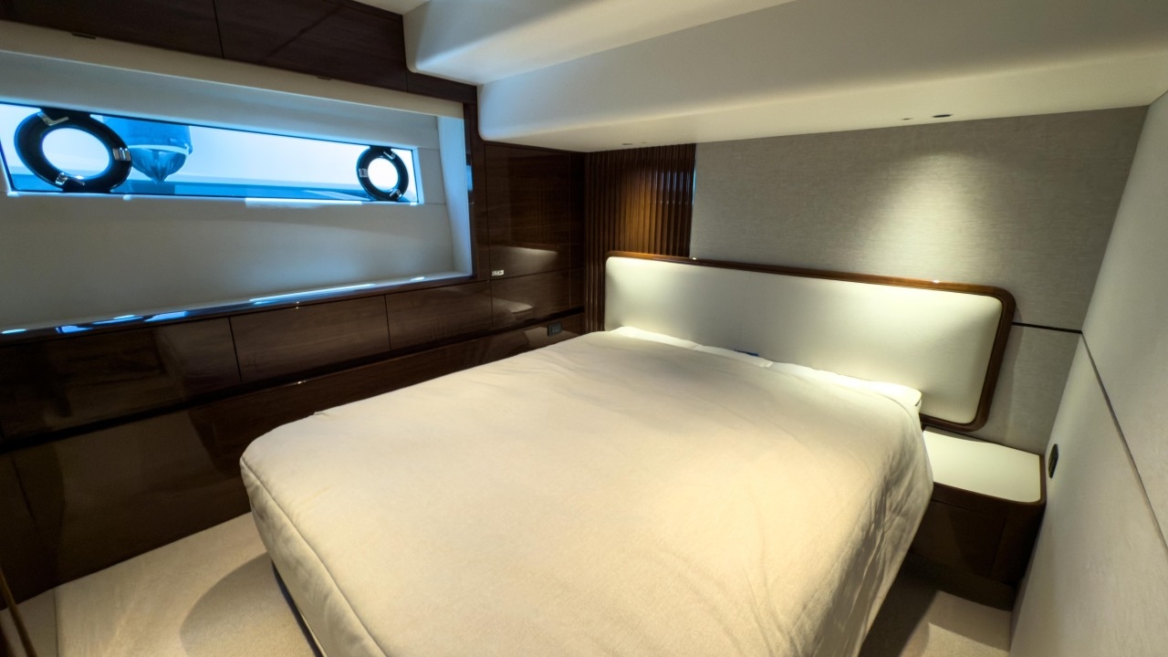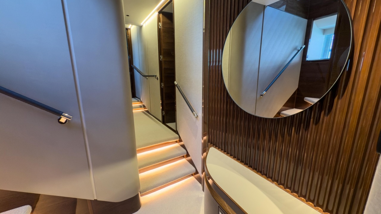 The main deck features a vast sociable cockpit – the largest in her class – perfect for entertaining, relaxing, or dining alfresco. Inside, a seamless saloon–cockpit connection, panoramic windows, and a sociable galley create an inviting, light-filled living space.