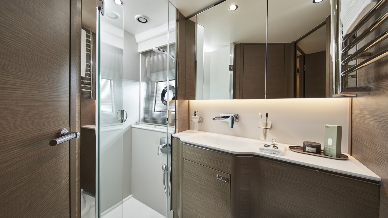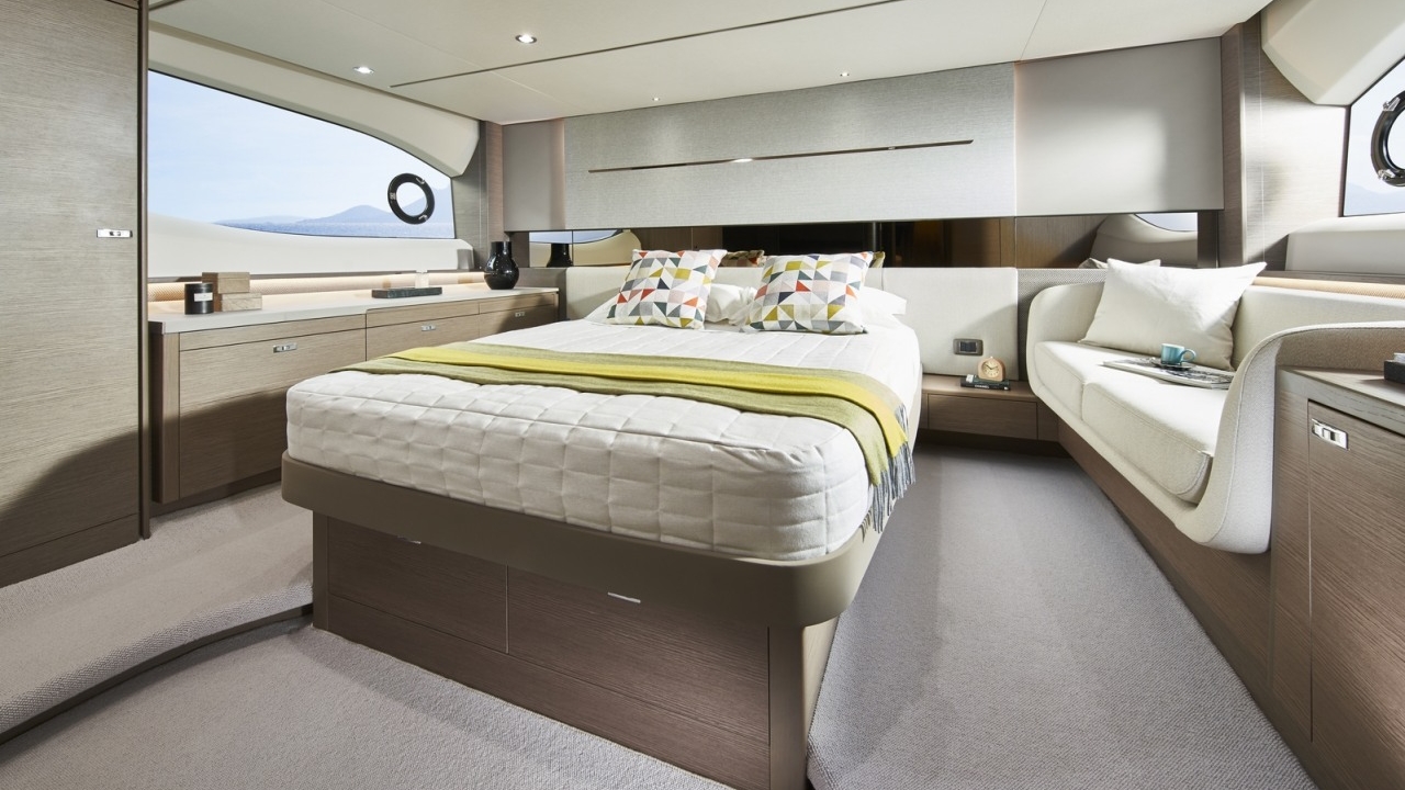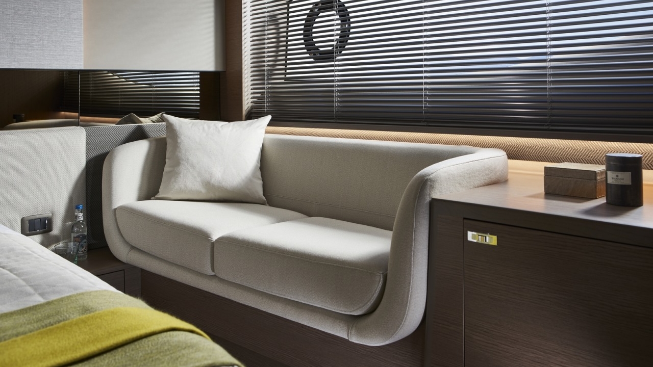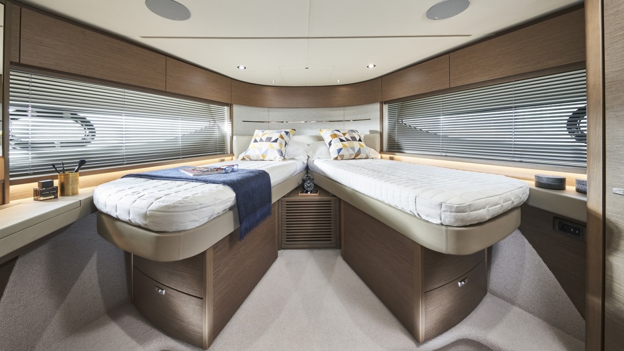 Au pont inférieur, ce nouveau V Class reste dans le ton avec une utilisation optimale de l'espace et plusieurs possibilités d'hébergement. Ses trois généreuses cabines le mettent en tête des yachts de cette taille. La cabine du propriétaire, pleine largeur, jouit de sa propre salle de bains. Les invités s'installent dans la cabine avant, dotée d'une salle de bains attenante et d'un grand lit transformable en couchettes individuelles en ciseaux, et dans une troisième cabine à couchettes superposées. Une cabine arrière avec lit simple est également disponible en option, pour un marin ou un invité surprise.