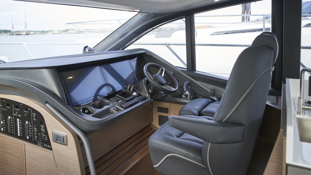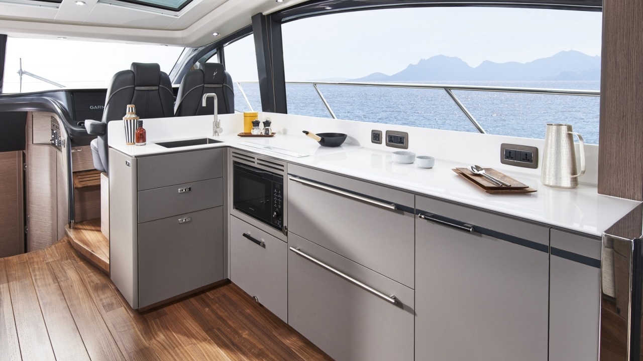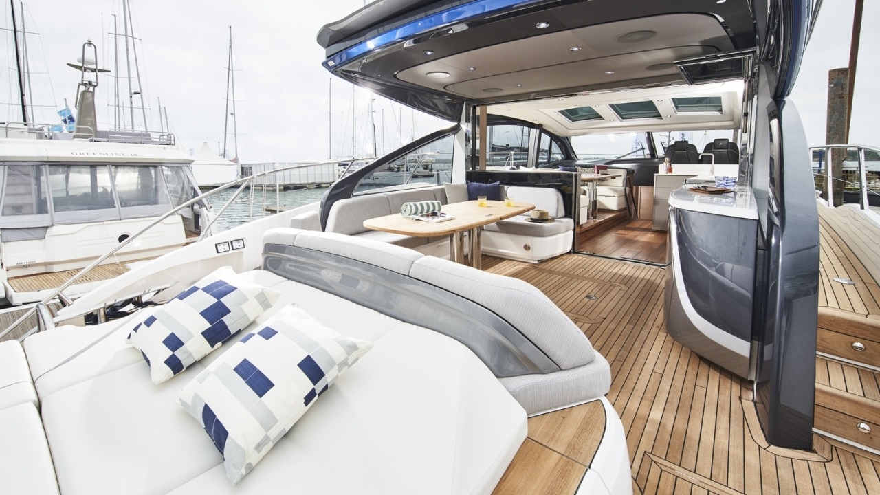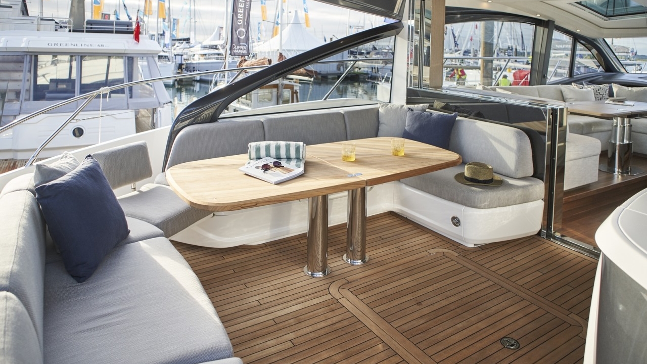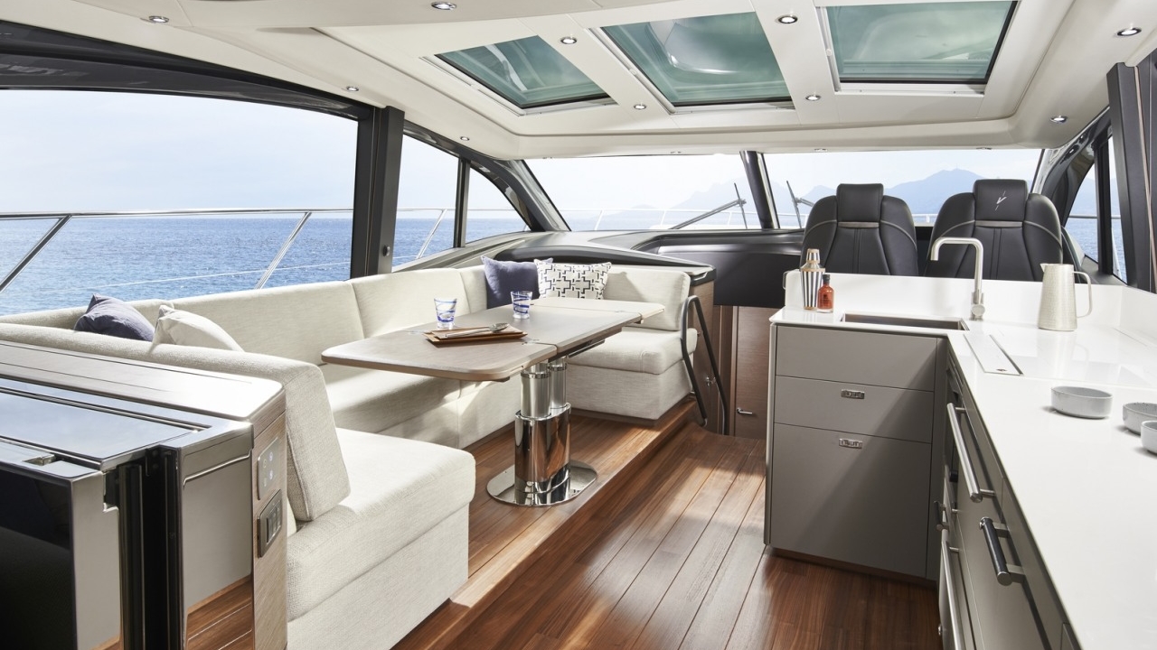Avec son extérieur profilé aux lignes dynamiques, son utilisation intelligente de l'espace et son exceptionnelle performance, le nouveau V55 est emblématique de la gamme Princess V Class. Son pont principal a été dessiné pour le plaisir de la navigation ouverte au grand air. Le vaste cockpit comprend une grande banquette en L plus des sièges arrière disposés autour d'une belle table en teck repliable, en face d'un bar équipé d'un évier et d'un barbecue électrique. Il communique avec le salon par une porte coulissante s'effaçant dans le plancher et une fenêtre ouvrant sur l'arrière de la cuisine, ce qui permet de fusionner les deux espaces selon les envies. Le pont principal est aussi équipé d'un grand bain de soleil à l'arrière du cockpit et de sièges et bain de soleil supplémentaires sur le pont avant. La vitesse de pointe à 37 nœuds promet toute la puissance des yachts de sport de la V Class.