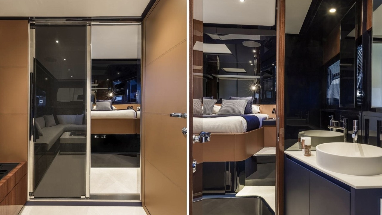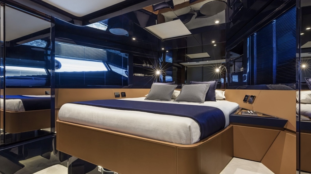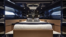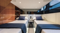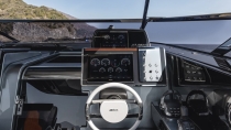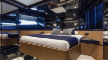 Finished in Metallic Shark Grey with double turquoise waterline and glossy mahogany interior, her specification includes gyro stabilizer, Hard Top, teak decking, Volvo Joystick, Active Ride system, watermaker, and a full entertainment package — among many others.