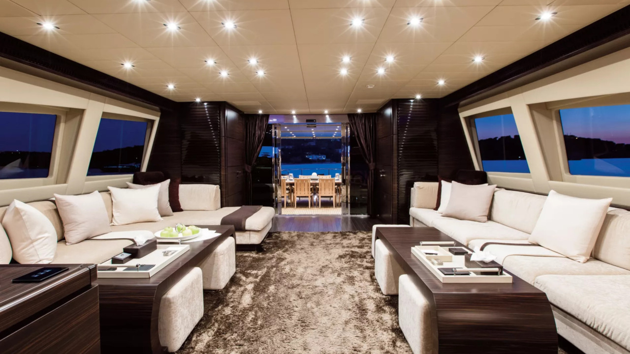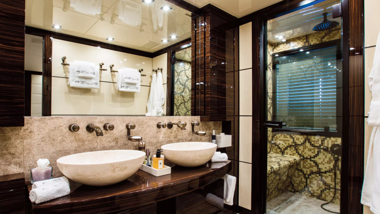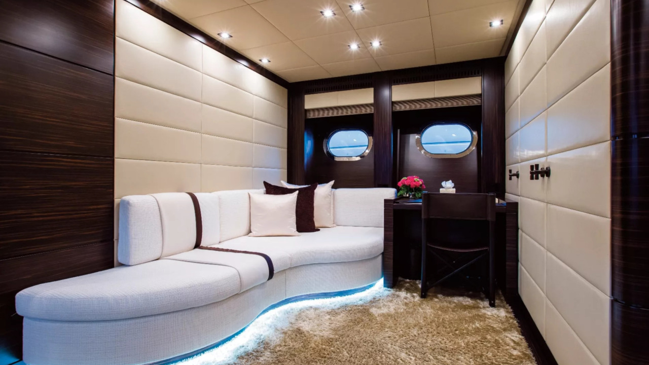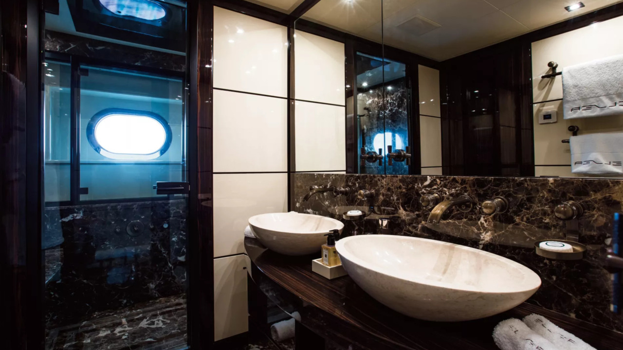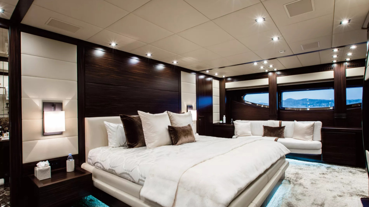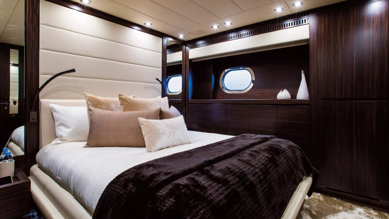 Her interior by Cristiano Gatto showcases ebony wood and marble, with generous volume and a contemporary style. Accommodation is for nine guests in four cabins, including a full-beam master suite.