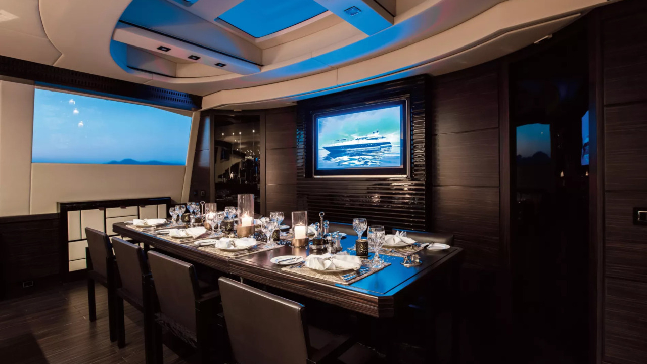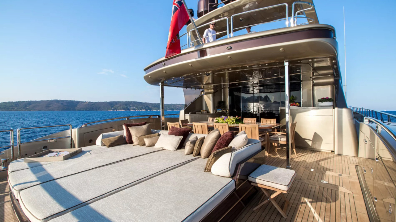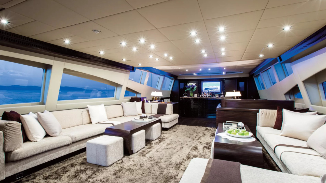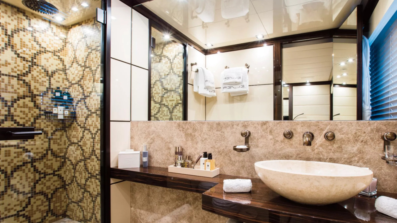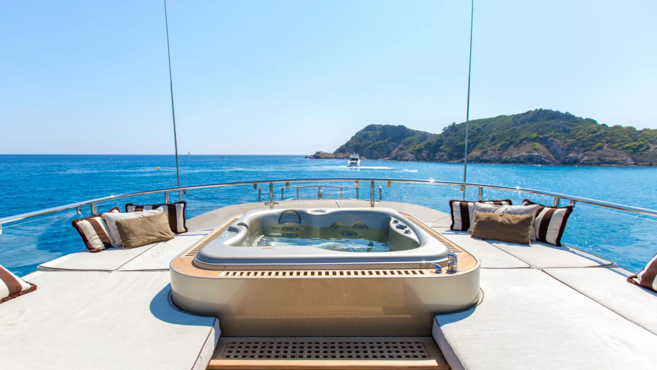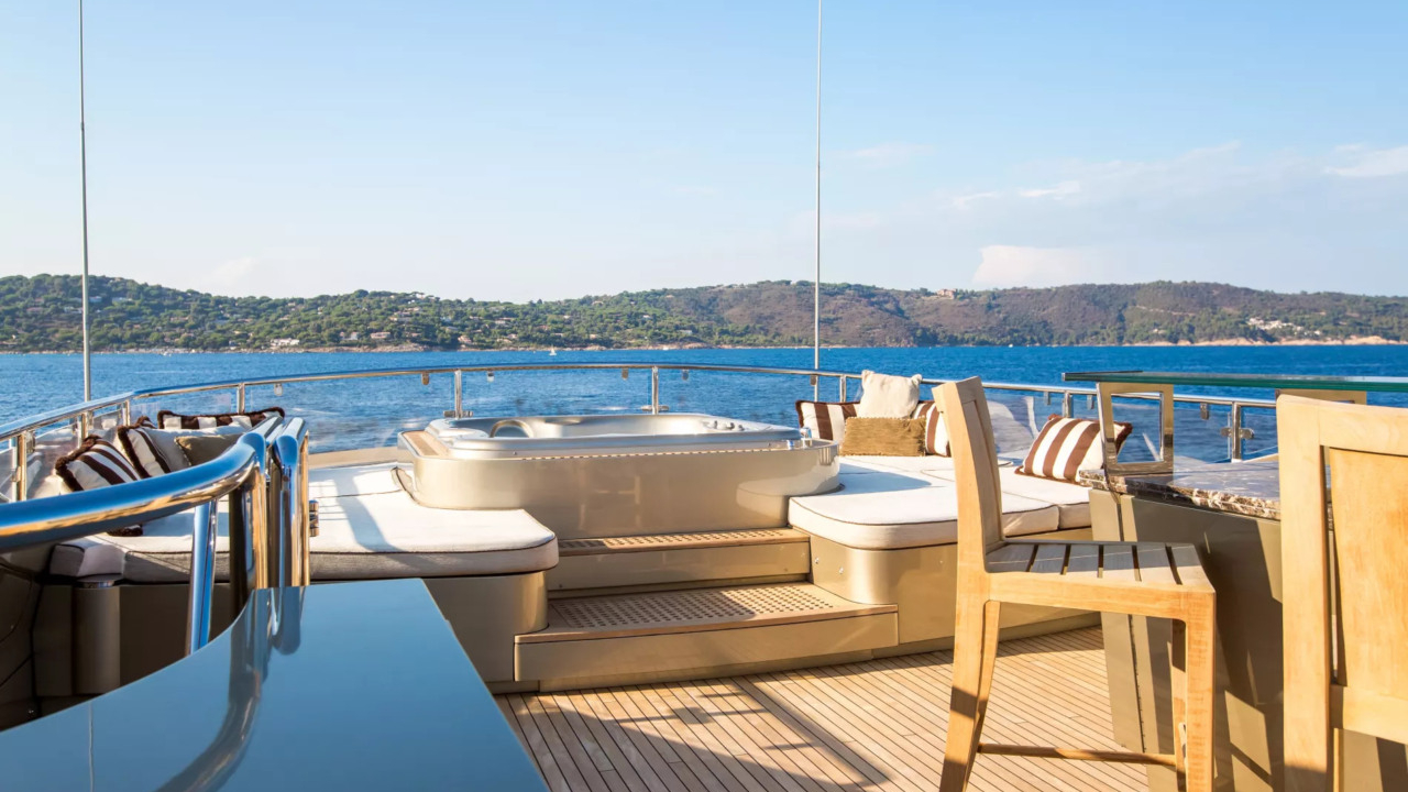 Her interior by Cristiano Gatto showcases ebony wood and marble, with generous volume and a contemporary style. Accommodation is for nine guests in four cabins, including a full-beam master suite.