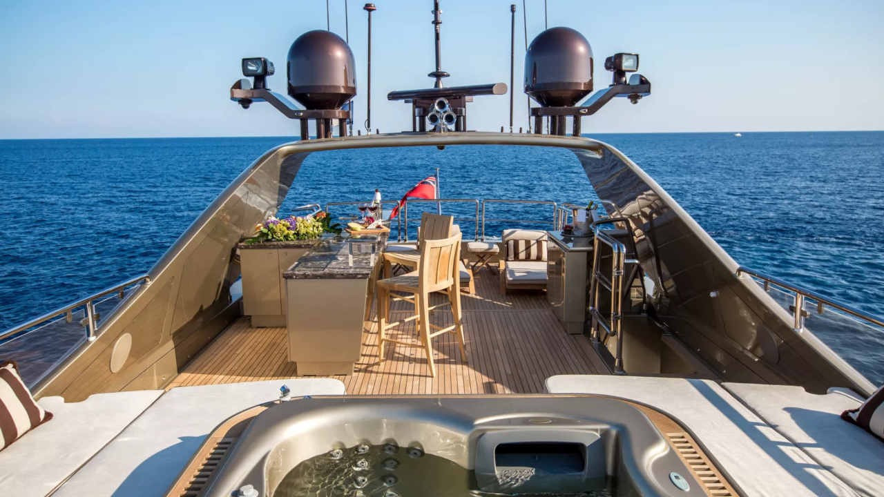Exterior highlights include a large flybridge with Jacuzzi and bar, aft deck sun pad with dining area, and bow seating. Aft garage holds a 5.3m tender and two Jet skis. She was repainted in 2021 and received a major MTU QL3 engine service
