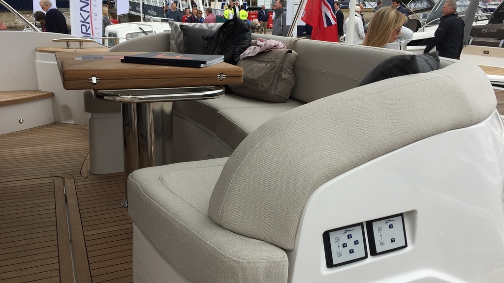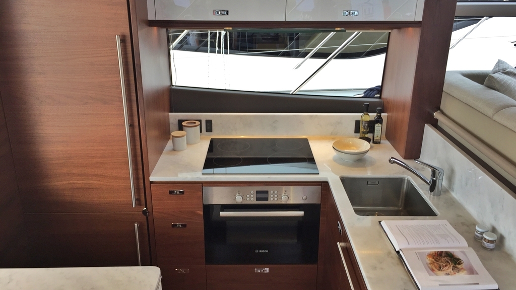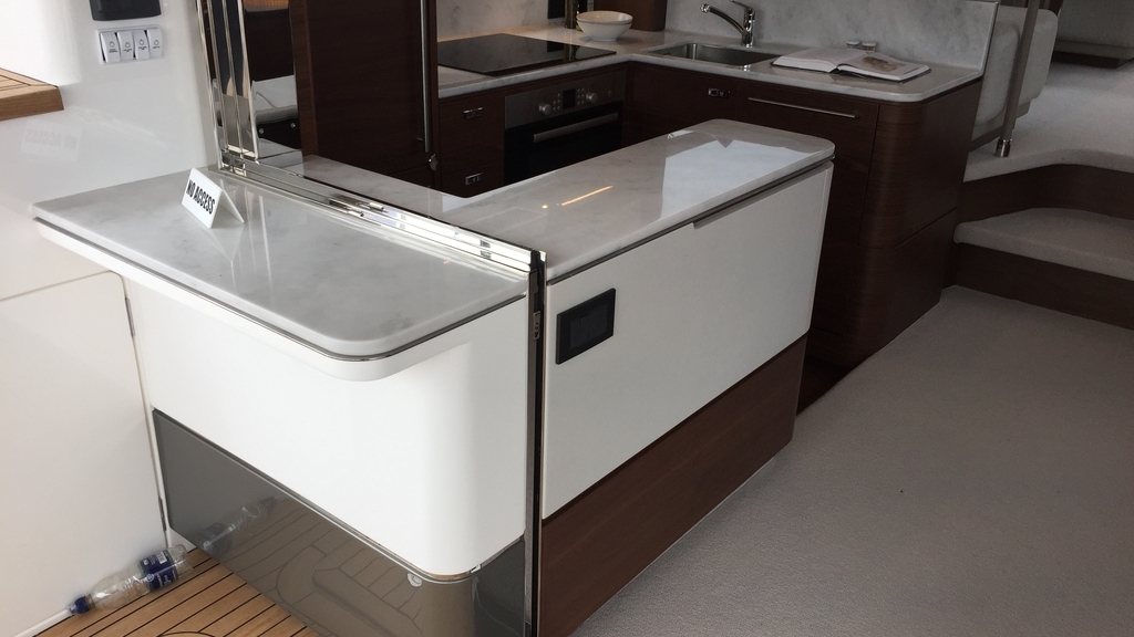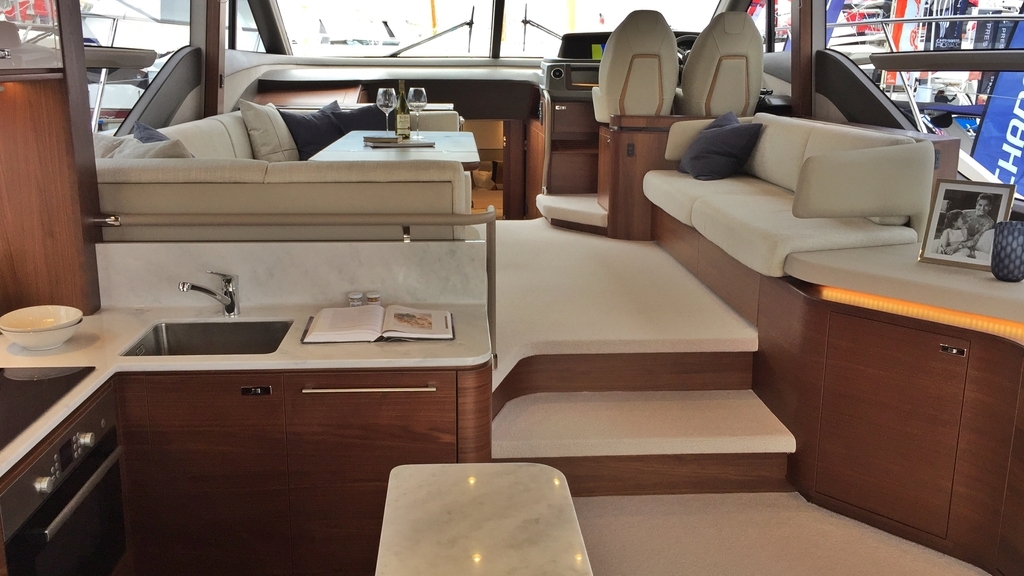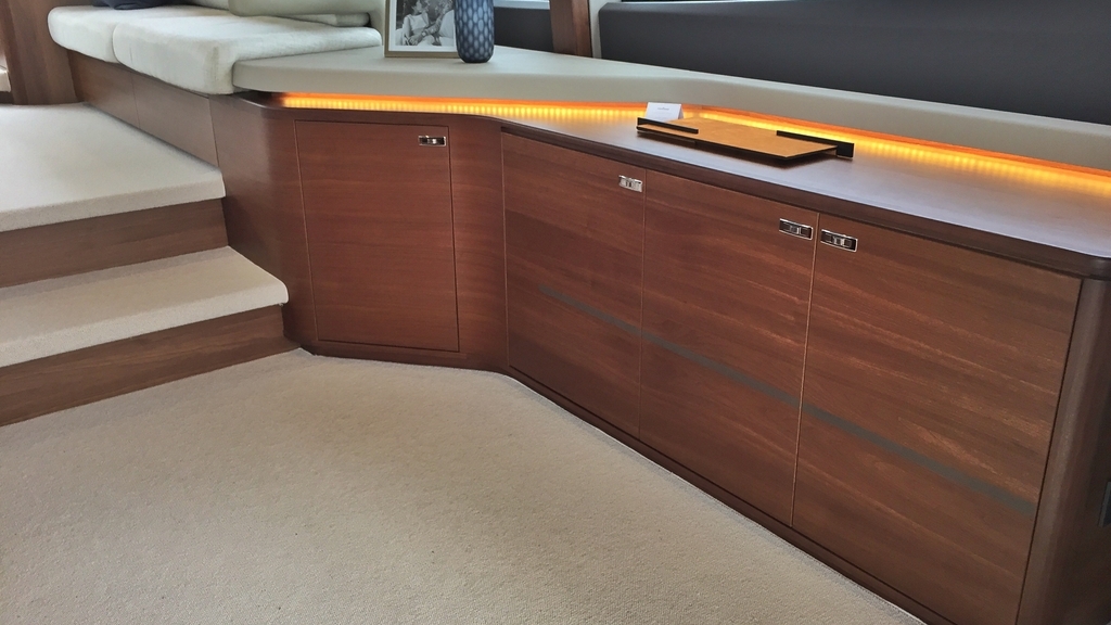 Interior: Walnut wood Satin finish (galley floor is walnut as standard)- Saloon folding leaf dining table