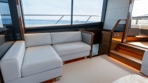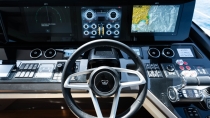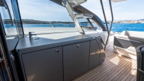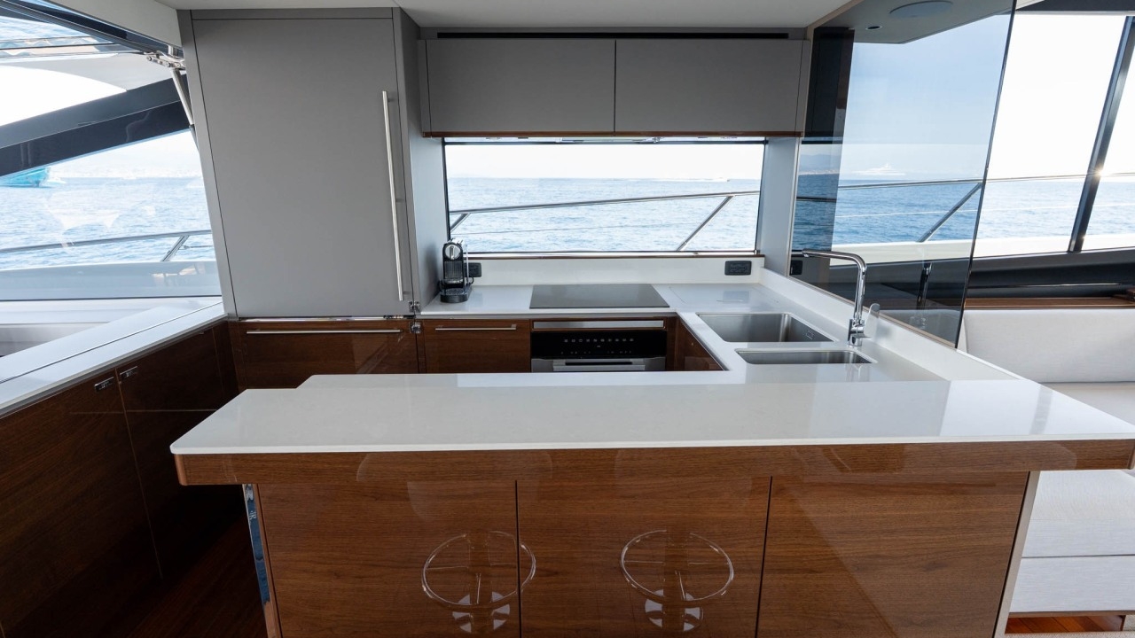 The main deck features a vast sociable cockpit – the largest in her class – perfect for entertaining, relaxing, or dining alfresco. Inside, a seamless saloon–cockpit connection, panoramic windows, and a sociable galley create an inviting, light-filled living space.
