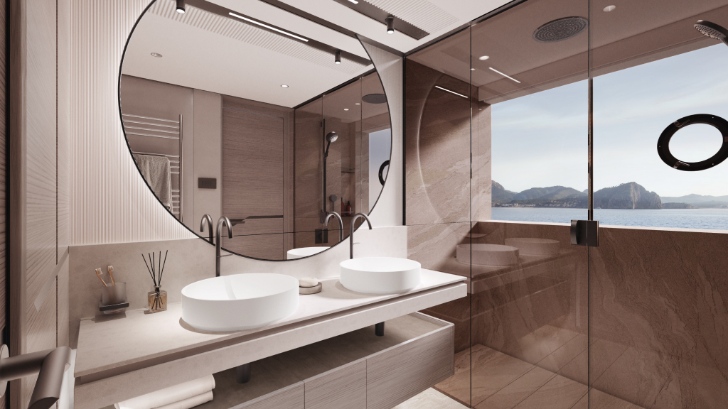 The enclosed Skylounge on the flybridge offers family entertainment with an optional 85-inch TV, while the spacious aft deck provides customizable entertainment setups. The yacht offers flexible cabin options for guests and crew.