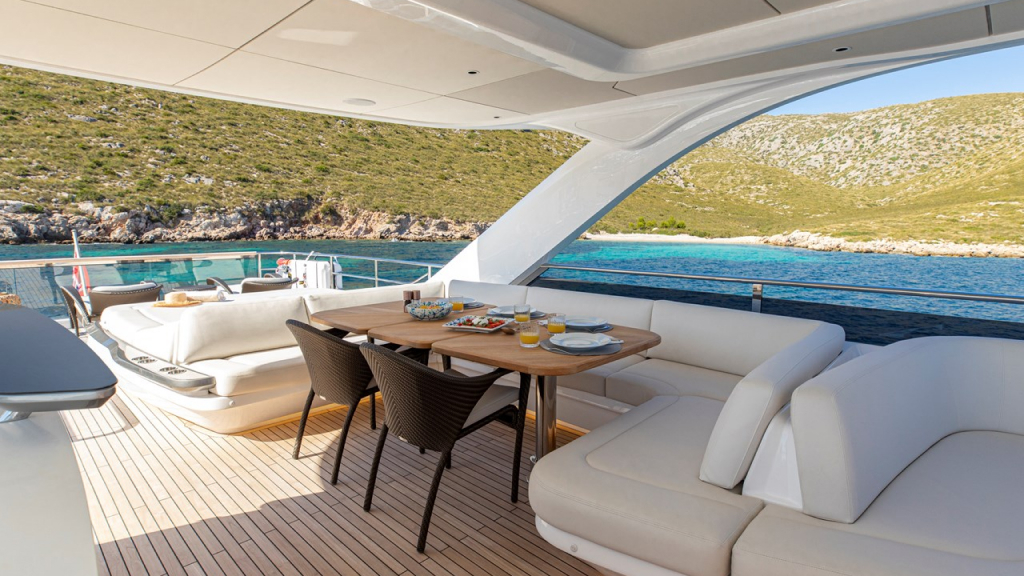 Her flybridge offers relaxed seating and dining areas combined with a fully equipped wetbar. Owners' can choose to specify the flybridge layout to their requirements with the option of a crane for a tender hidden within the large sunpad, free standing sun loungers or a spa bath.