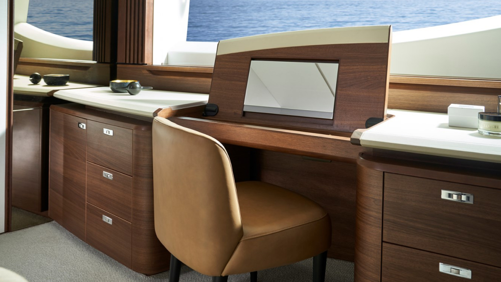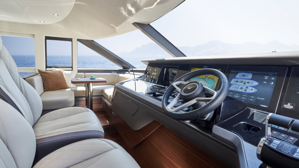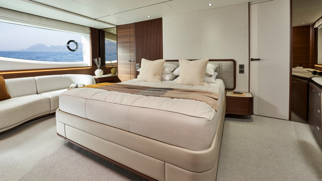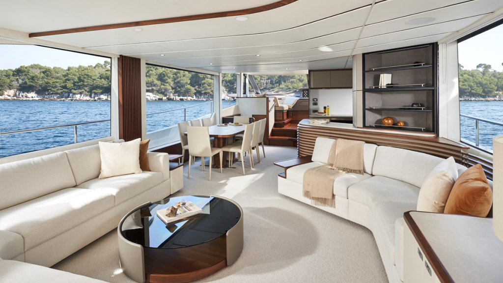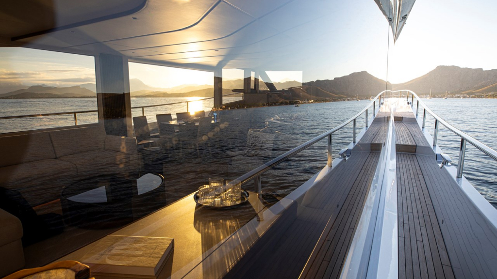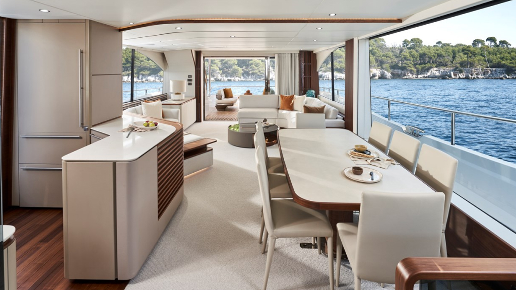 The main deck offers an uninterrupted flow through from the cockpit to the helm featuring vast windows along the saloon to experience the surrounding panoramic views. For owner's who prefer a more private experience, optional partitions to the galley and wheelhouse are available.