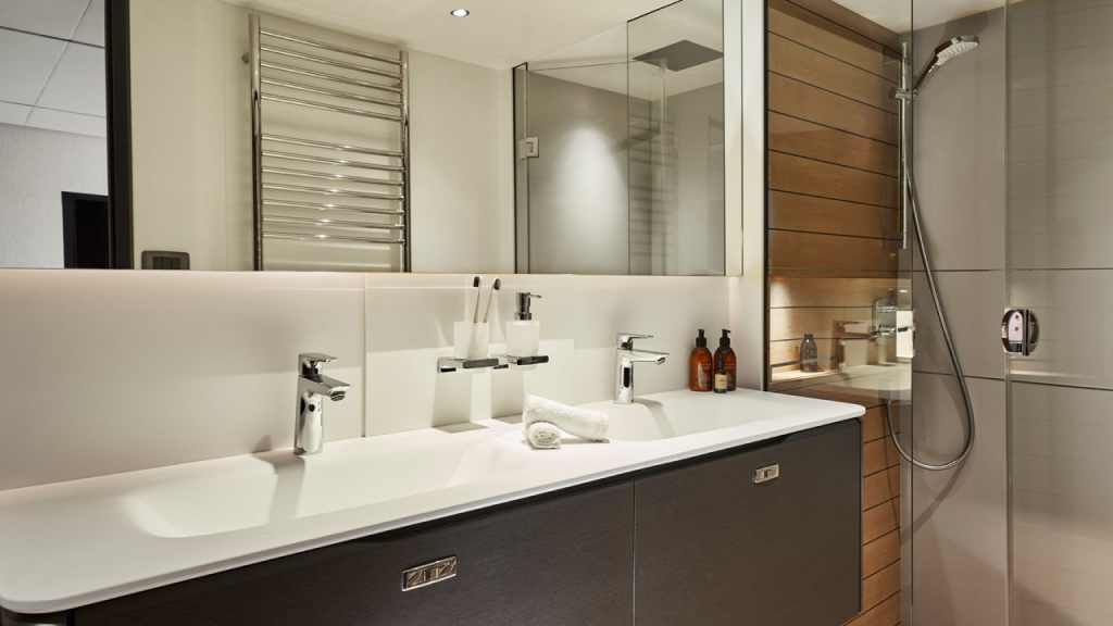 Below deck, four en-suite cabins sleep eight supported by crew quarters.