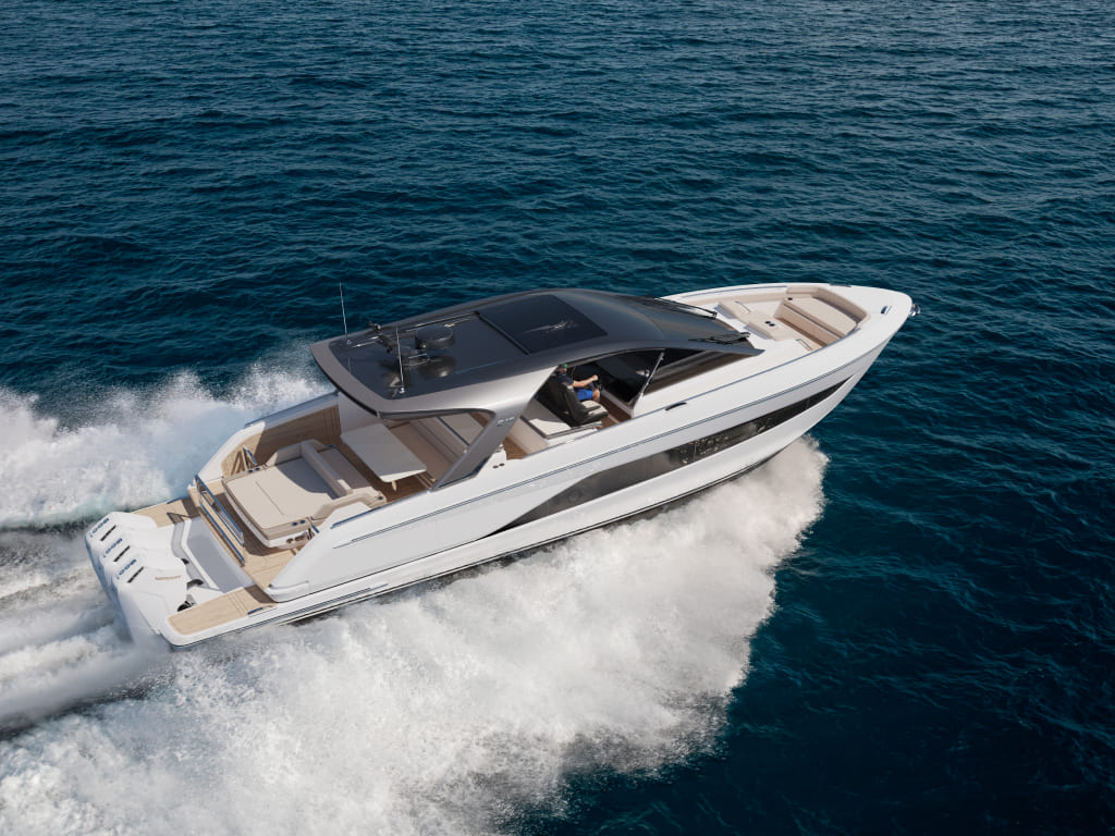 This version is tailored for those who revel in open-air adventure. Its main deck, left fully open, is paired with a protective hardtop. The cockpit features an aft sunpad, forward-facing seating with a dining table, and fold-down side benches to expand versatility. An exterior galley, with forward and aft wet bars, includes an electric grill, sink, drawer fridge, and storage. At the helm, triple seats offer commanding views, while the foredeck provides further flexible seating arrangements. Below deck, a lower saloon with convertible dinette, day head, and aft cabin forms the standard arrangement, with options for a forward cabin or galley to suit personal preference.