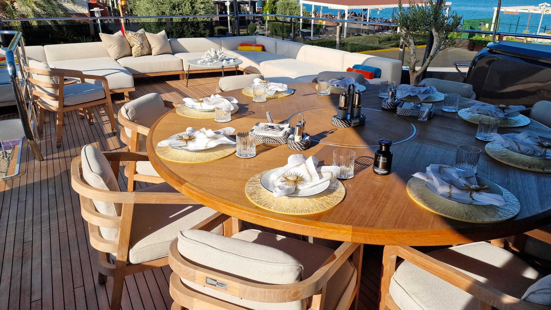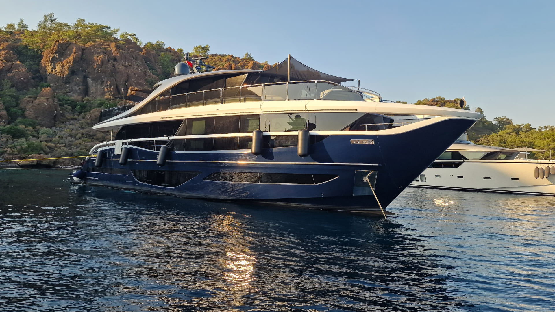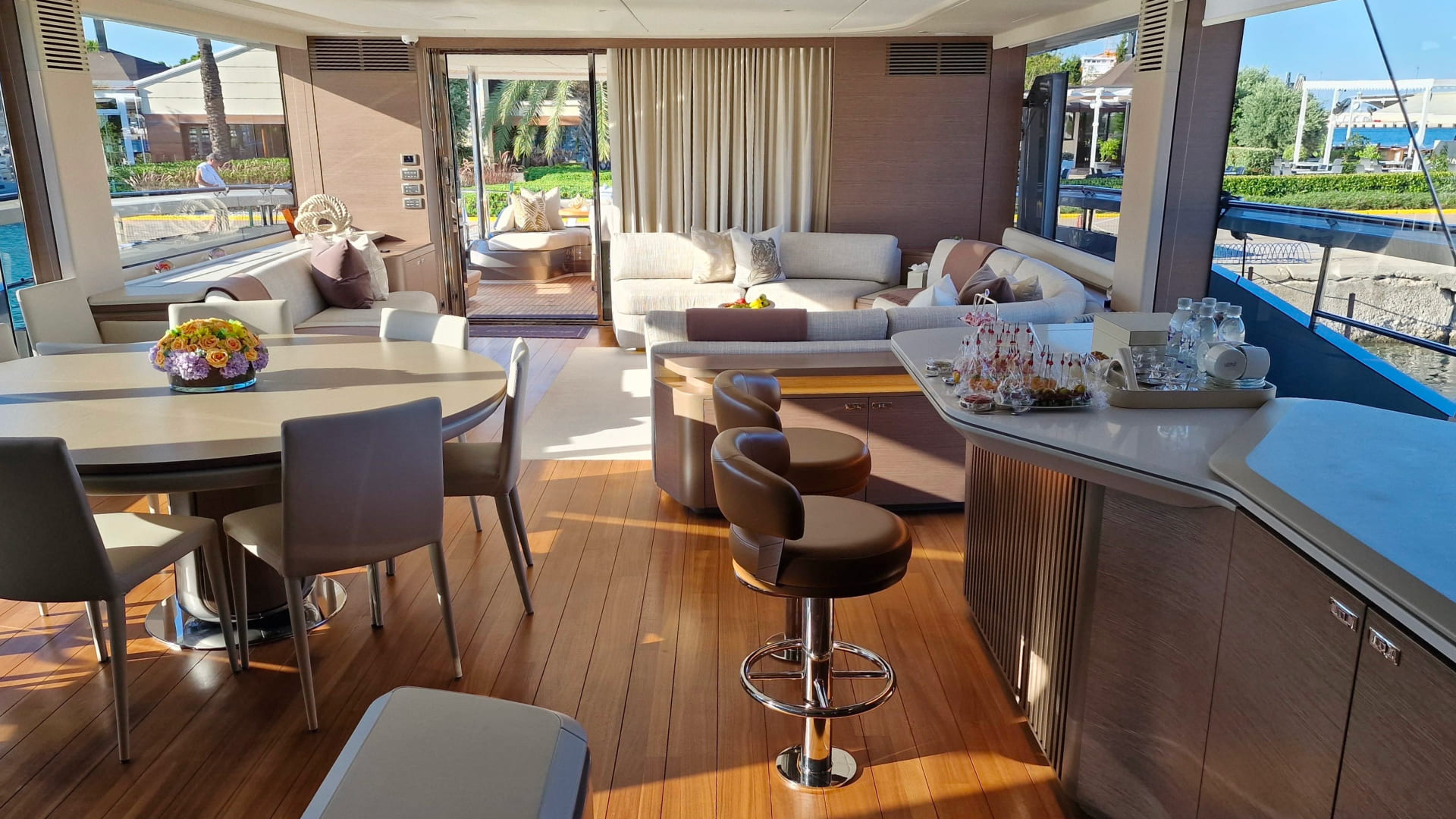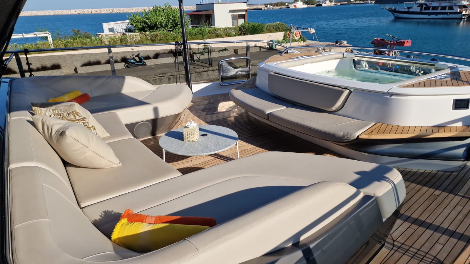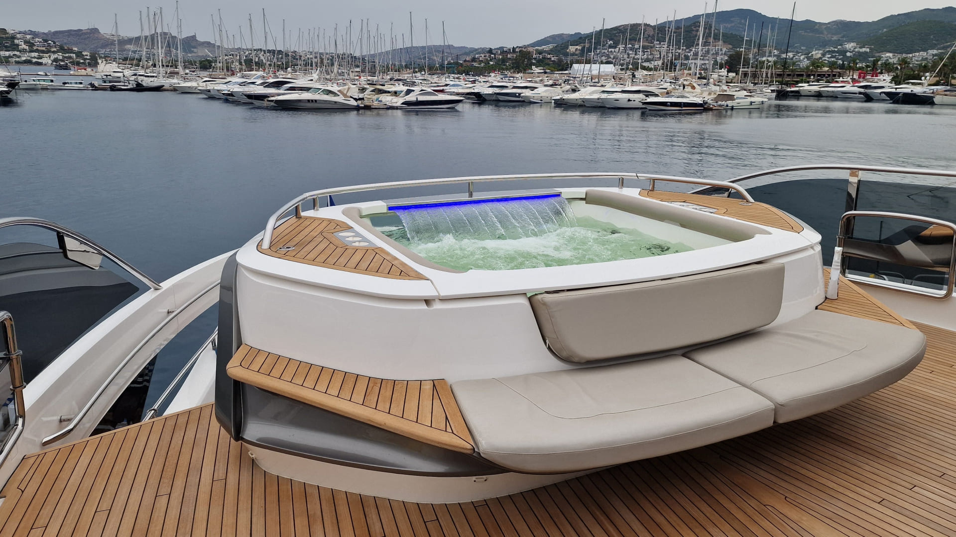 She comes with an exceptionally high specification, featuring an extensive list of options rarely seen on a yacht of this size – including a jacuzzi on the sundeck, fin stabilizers, and a Williams DieselJet 505 tender housed on the aft.