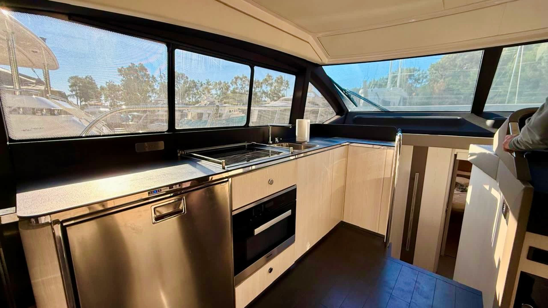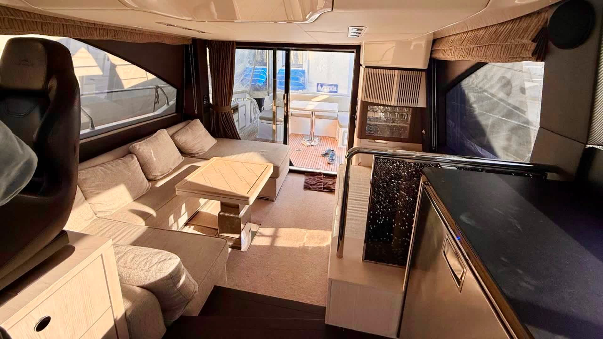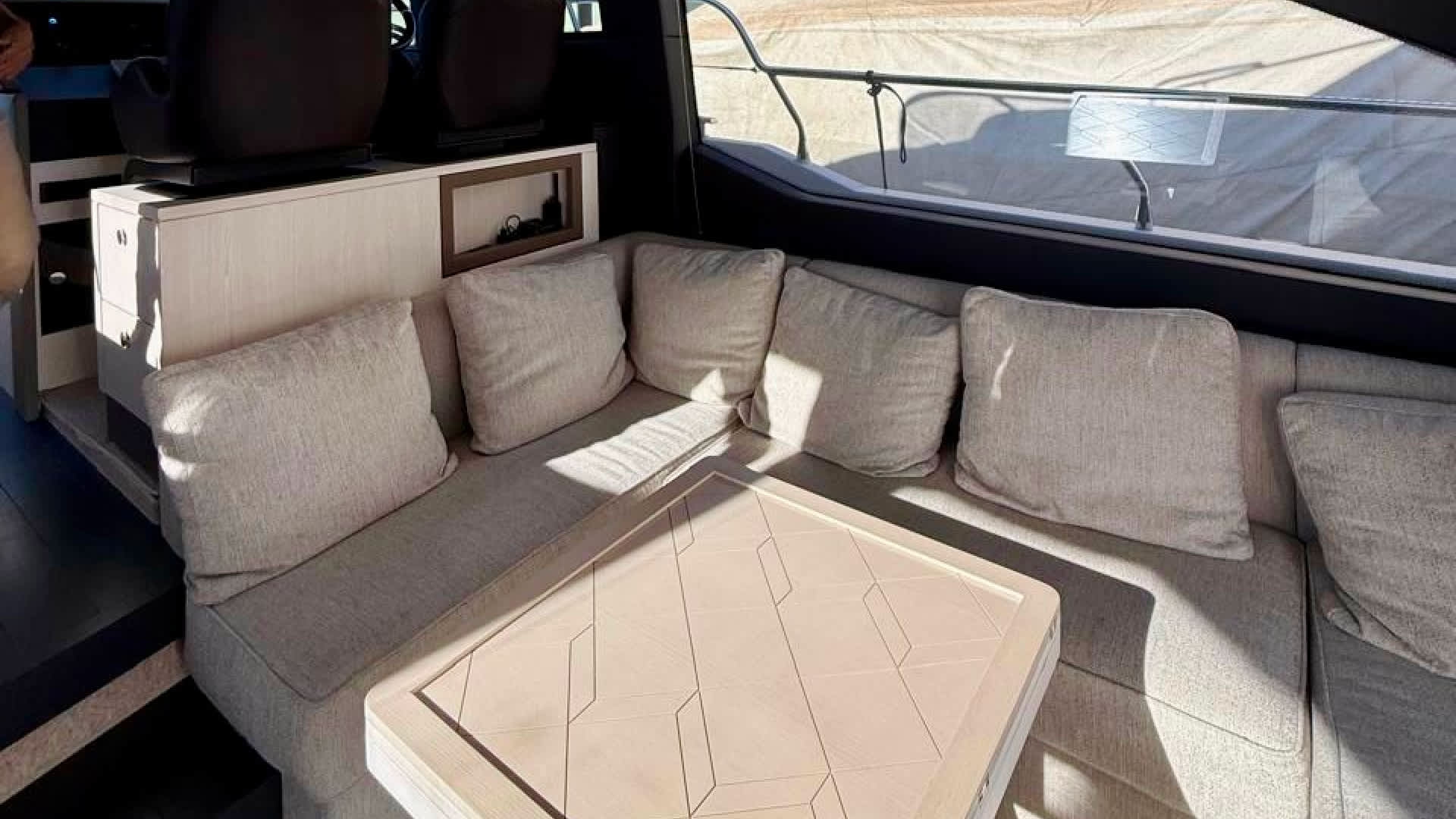 On board, the Azimut 50 offers a spacious flybridge with lounge and dining area, a cozy cockpit with a direct access to the hydraulic swimming platform, and a sunbathing zone at the bow.The bright salon features panoramic windows, a comfortable seating area with a dining space, and a fully equipped galley.