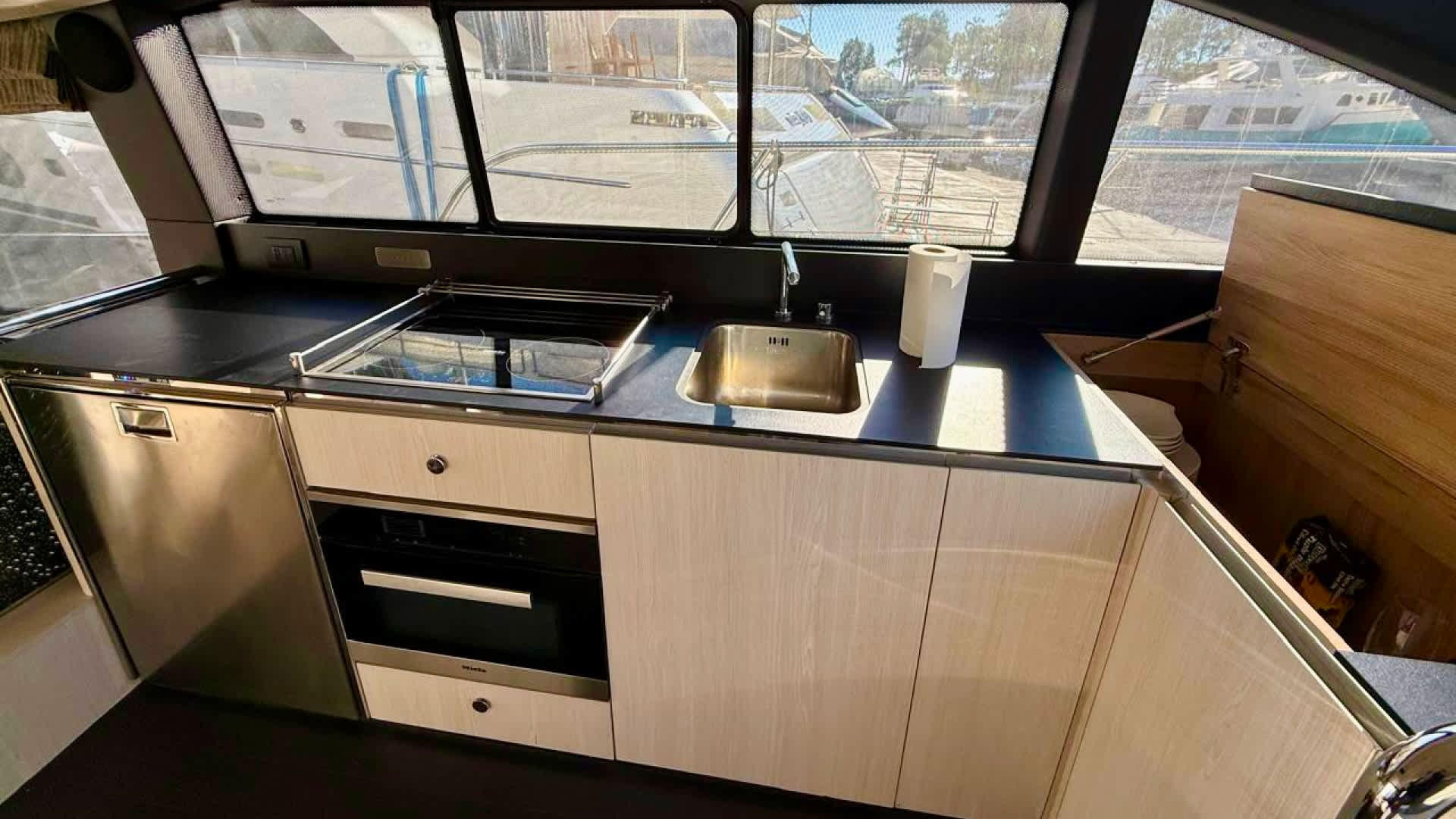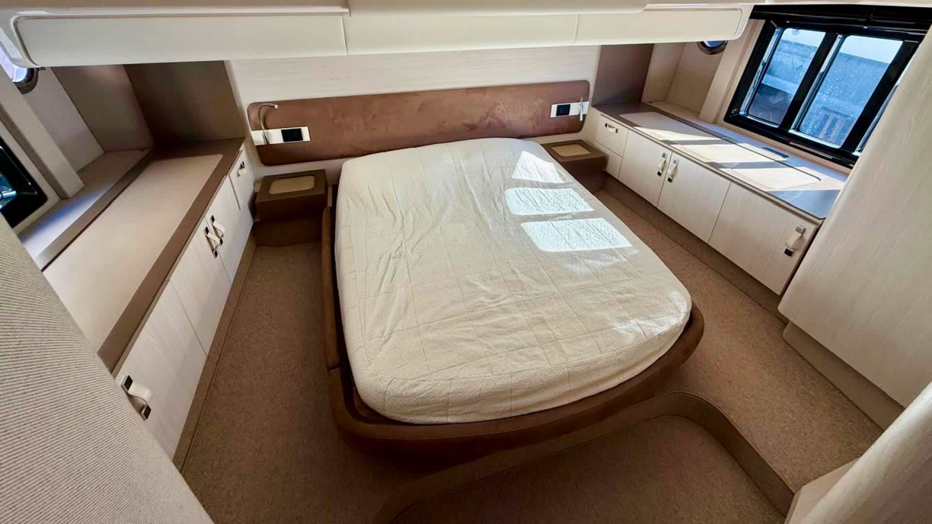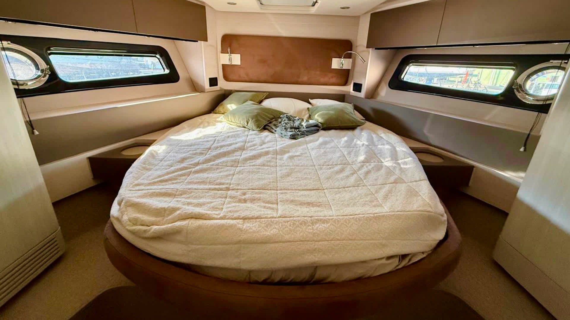 The yacht accommodates three cabins — a full-beam master, a forward VIP, and a guest cabin — along with two bathrooms with showers. Equipped with modern navigation systems, generator, air conditioning, and entertainment systems, it also comes with a Williamstender, making every trip convenient, whether for coastal cruising, shore transfers or water activities.