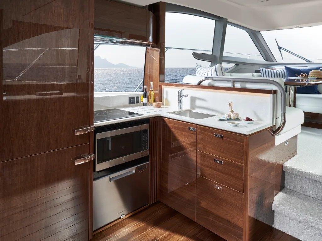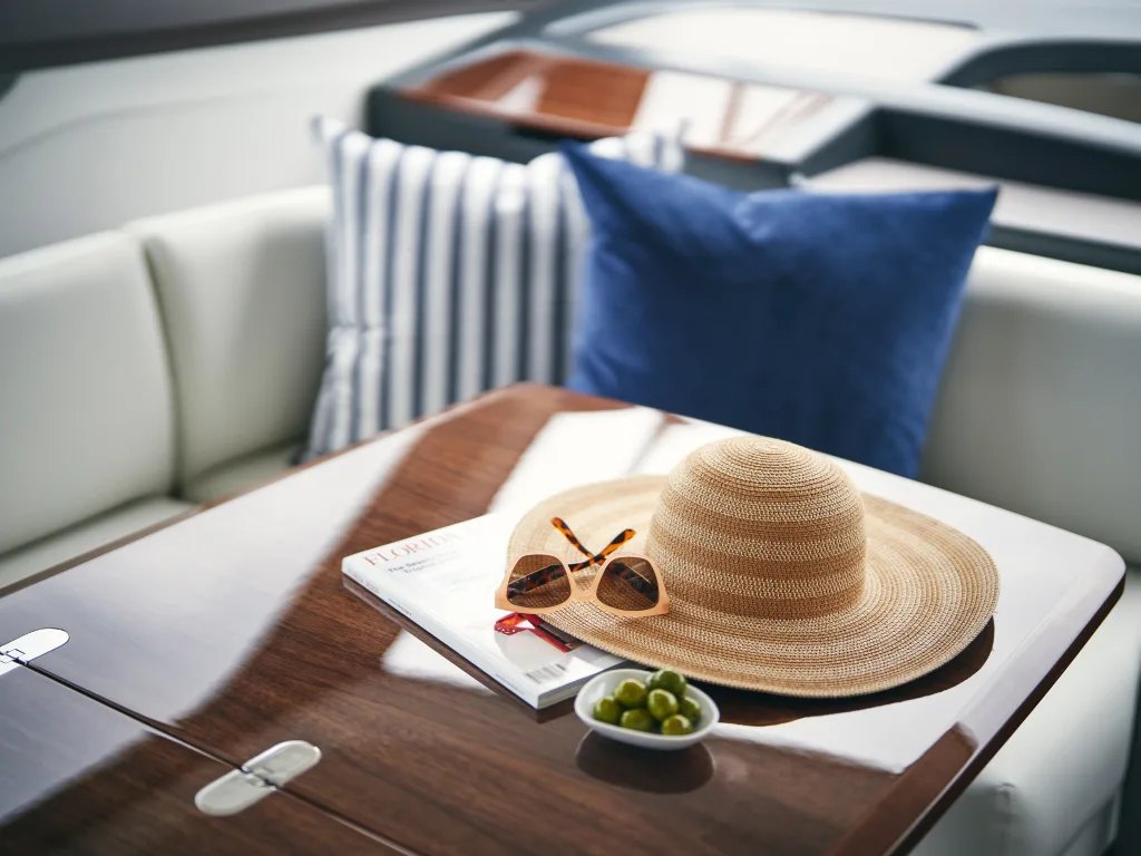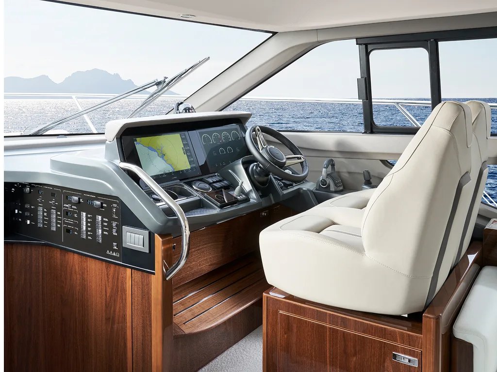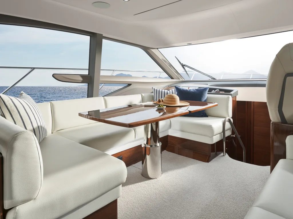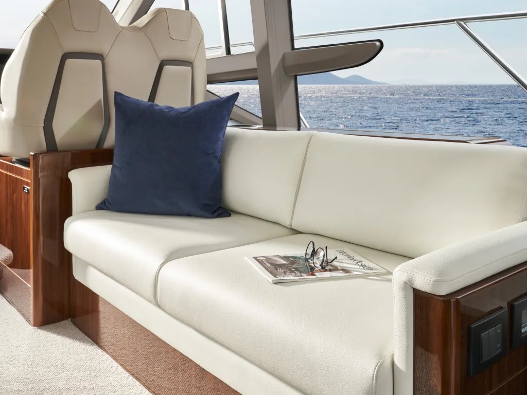 - Cockpit and Flybridge upholstery including helm seats in Comfort Exterior IV MET/LINETEX/TANNERY Main Upholstery Colour: MET MACADAMIA