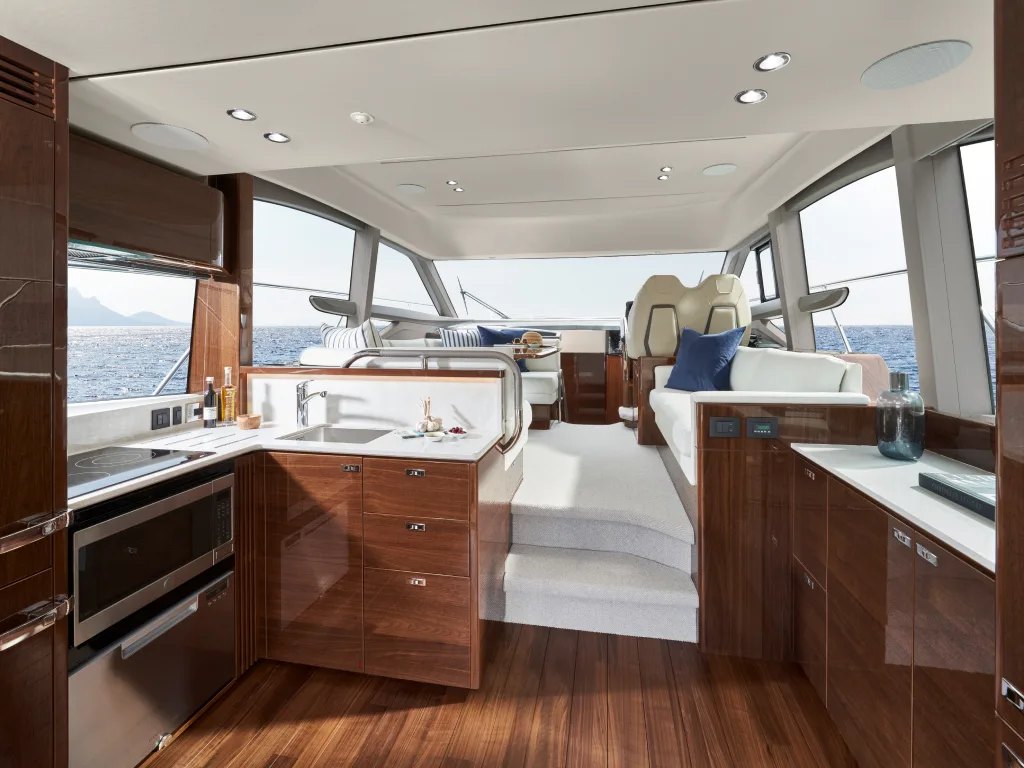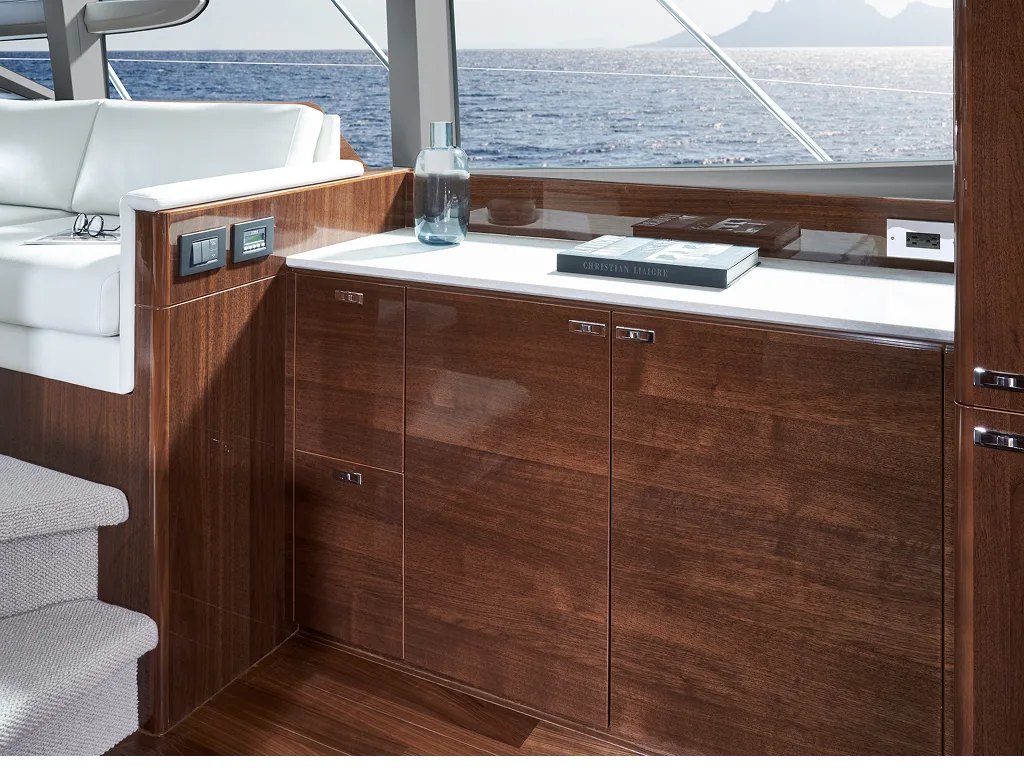 - Walnut interior wood satin finish (helm foot rest and galley floor are V groove walnut as standard)