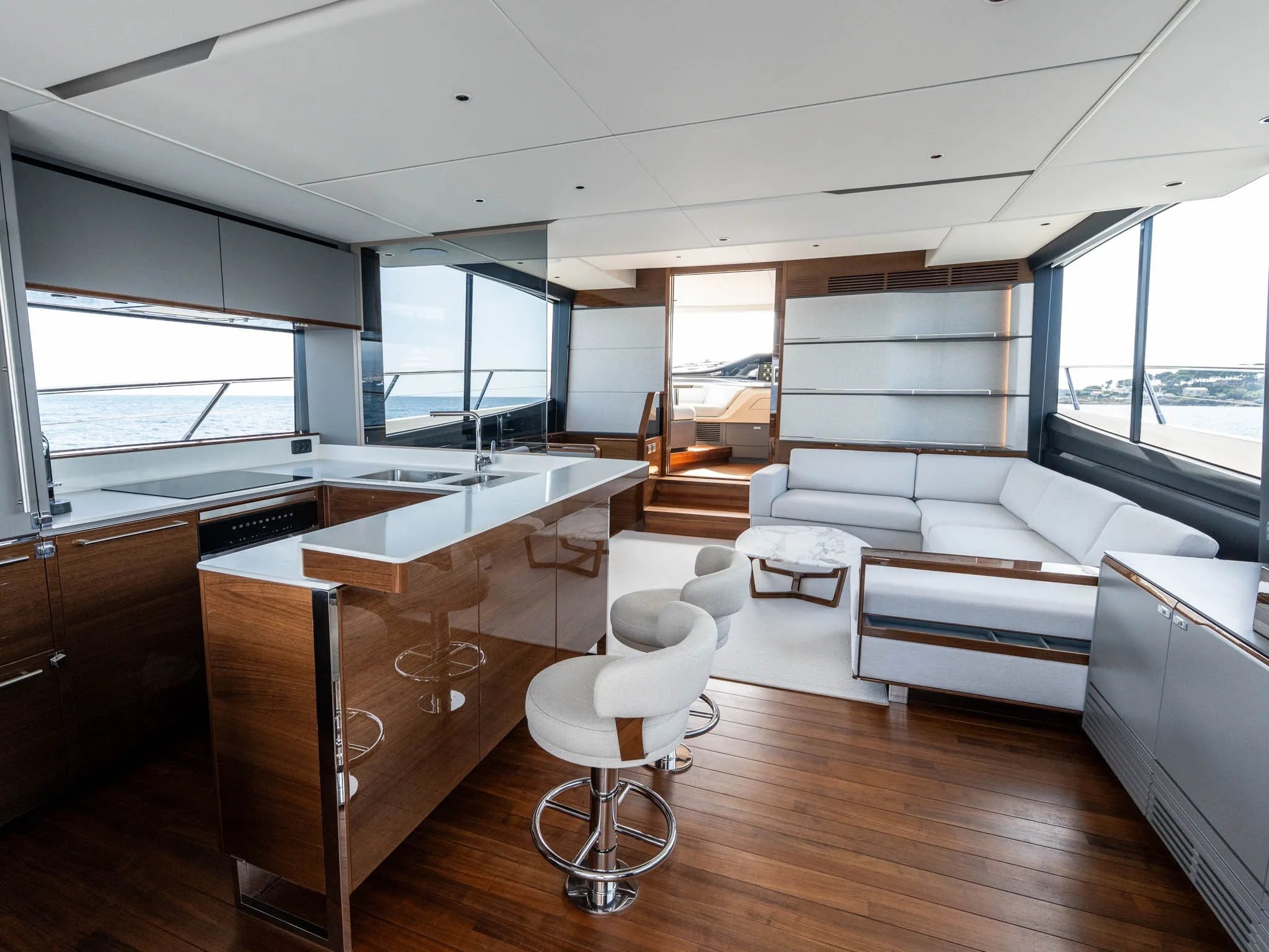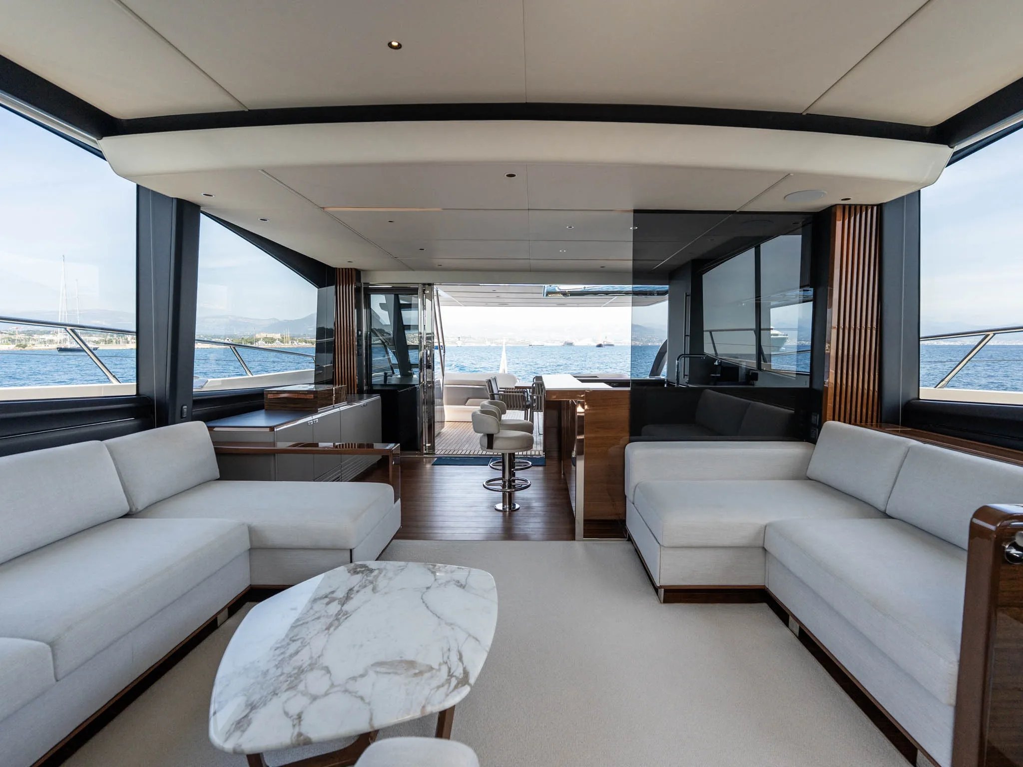- Expansive main deck with vast cockpit dining area, open-plan saloon, sociable galley with breakfast bar, and panoramic windows