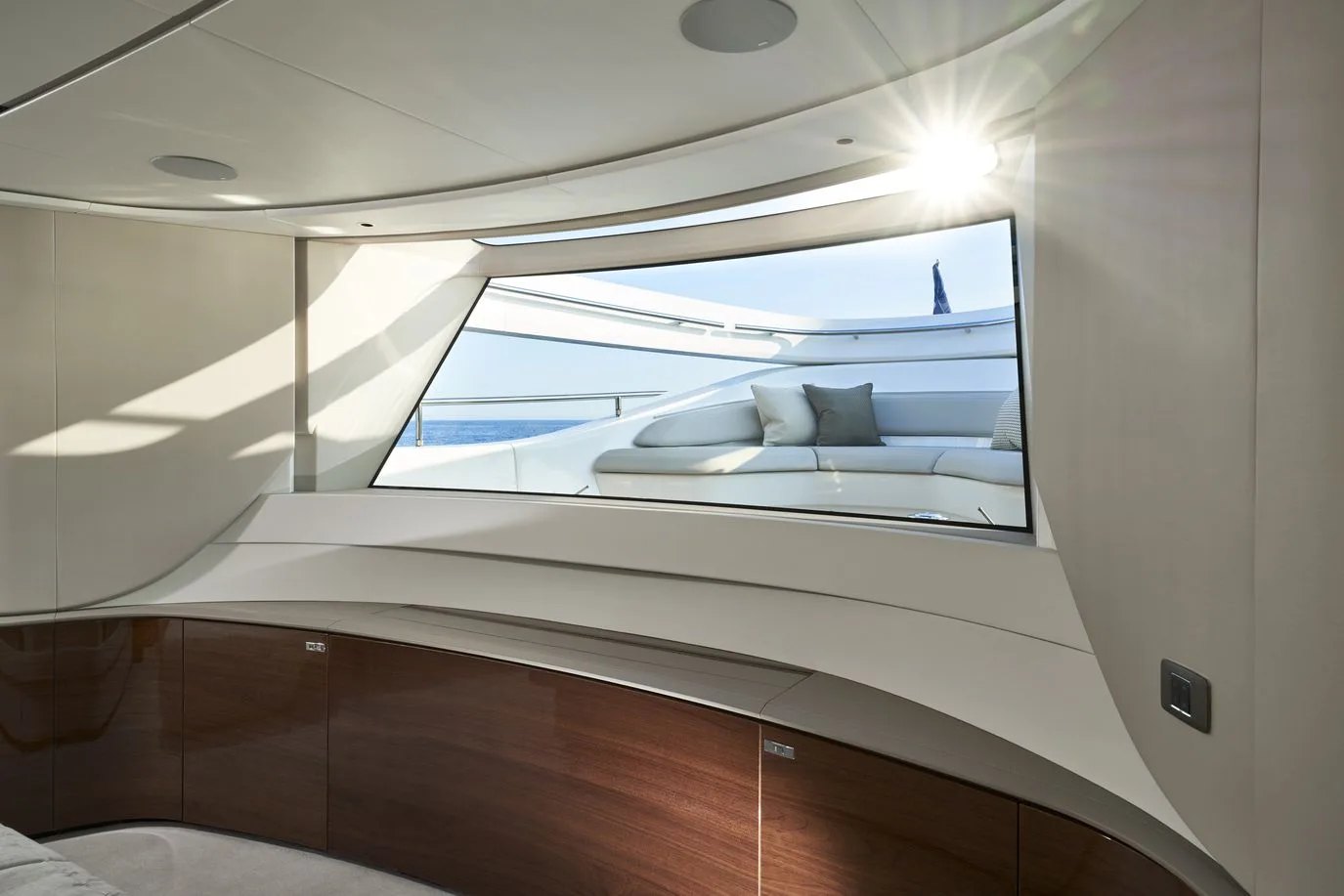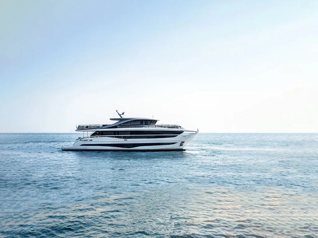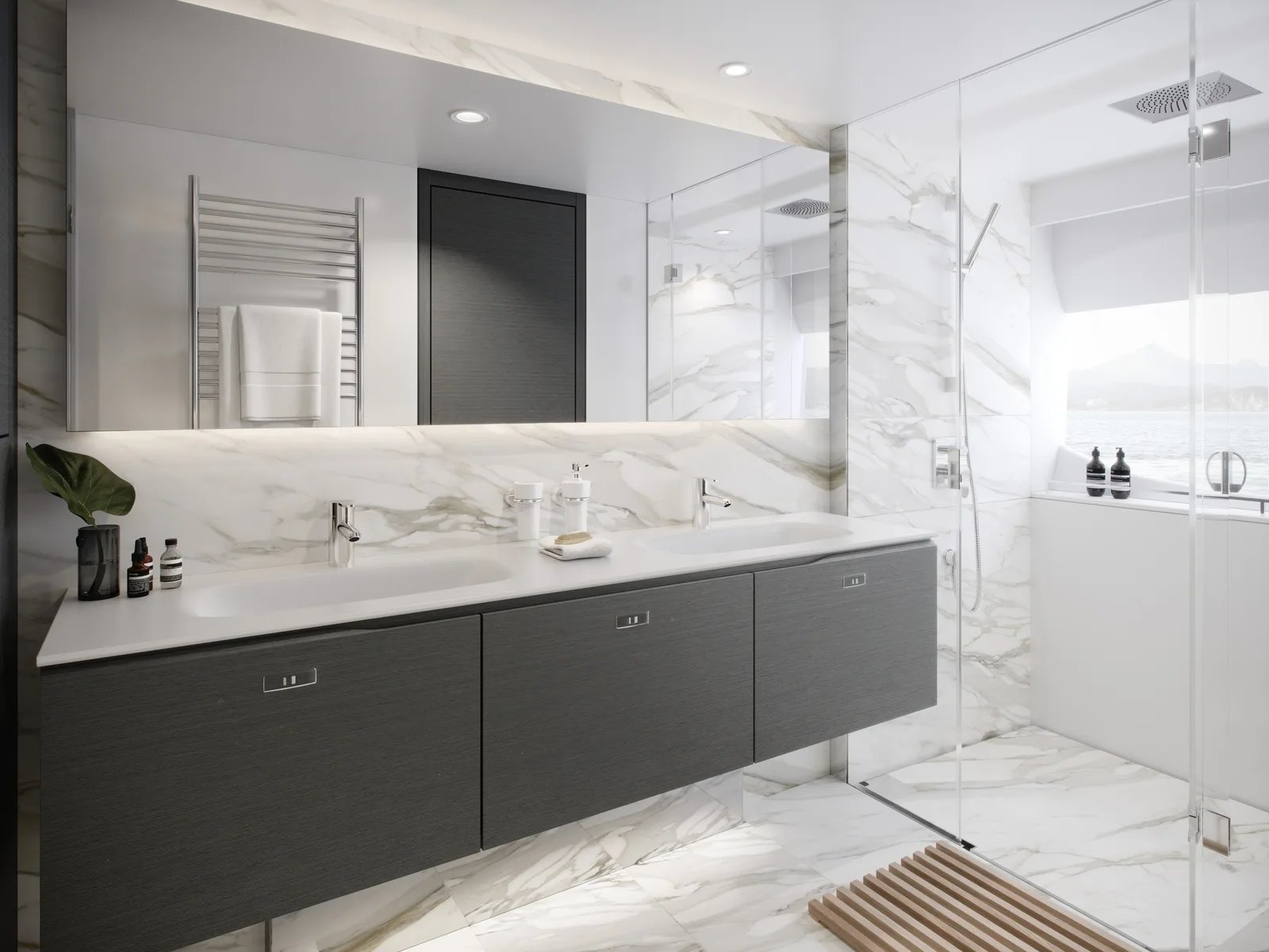 Characterised by beautifully sculpted surfaces and long flowing lines, the X95 defines a striking design language for this new Class. Both her flybridge and main deck cover almost the full length of the yacht, delivering expansive spaces with flexibility that enables you to define each journey around your guests’ preferences. With a fuel capacity of 13,400 litres, the X95 has the range for far-reaching, adventurous voyages. Experience space akin to a megayacht as you enter her main deck saloon and witness a line of sight right through to the forward window. Ascend the internal staircase to the upper deck and another unique experience awaits: a fully enclosed and climatecontrolled Sky Lounge. Taking pride of place on her lower deck is the full beam Master Stateroom with en suite, complemented by her Forward Stateroom with walk-in wardrobe and en suite bathroom. Additional port and starboard guest cabins can each be configured with two single beds or one double bed, whilst generous crew quarters complete her extensive accommodation.