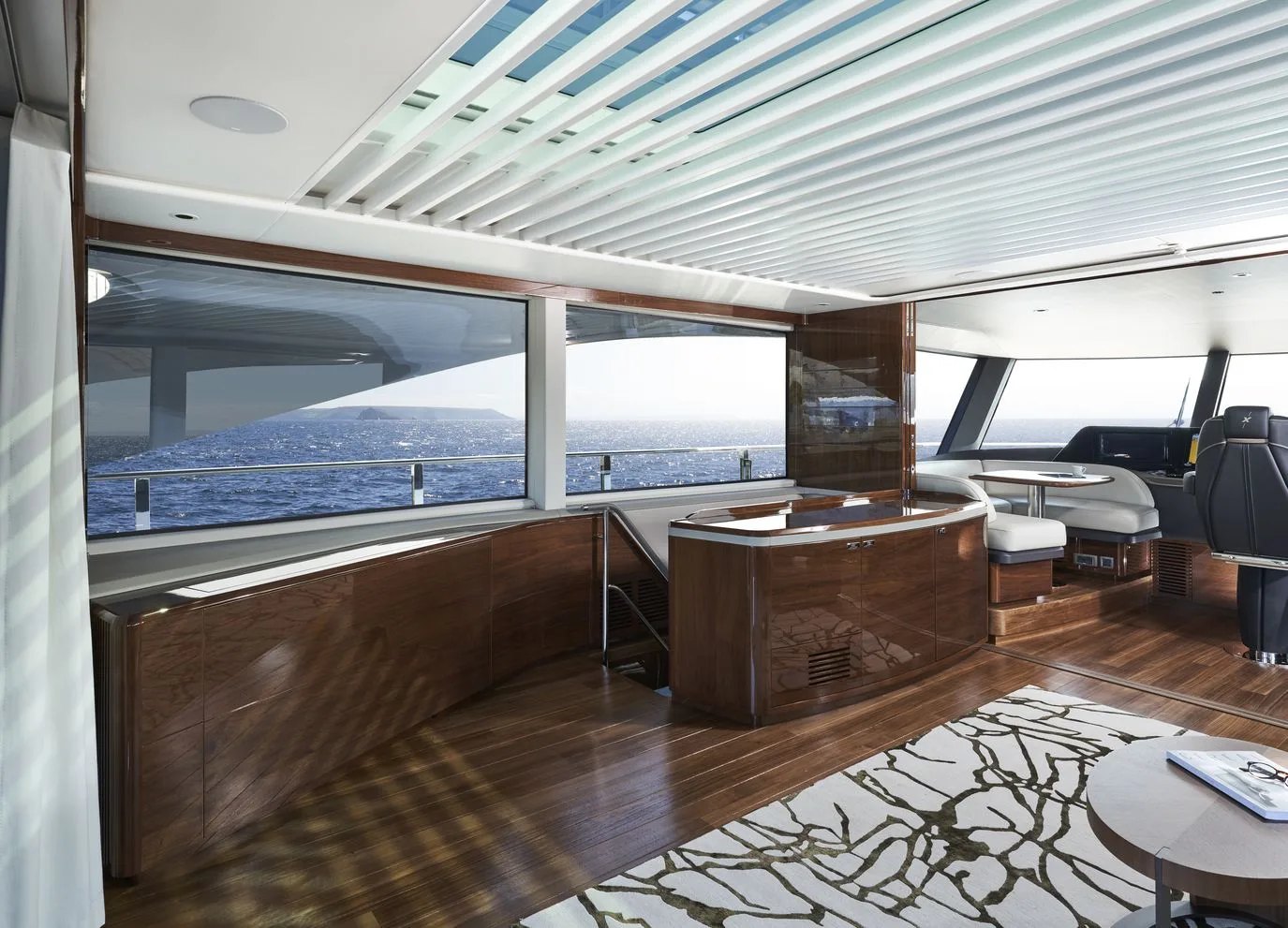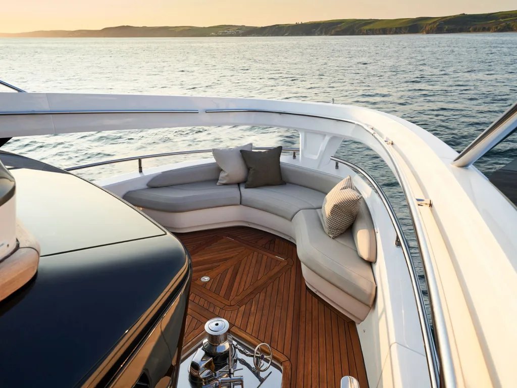 - Teak-laid transom platform and stairs, cockpit deck, flybridge, flybridge stairway, side decks and foredeck walkthrough