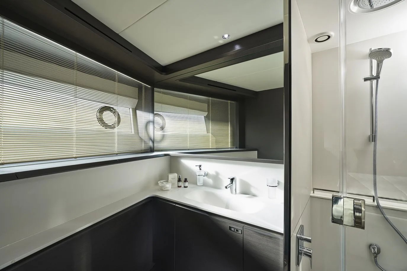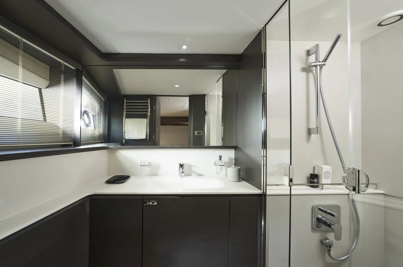 - Bathroom with separate stall shower, electric freshwater toilet and washbasin